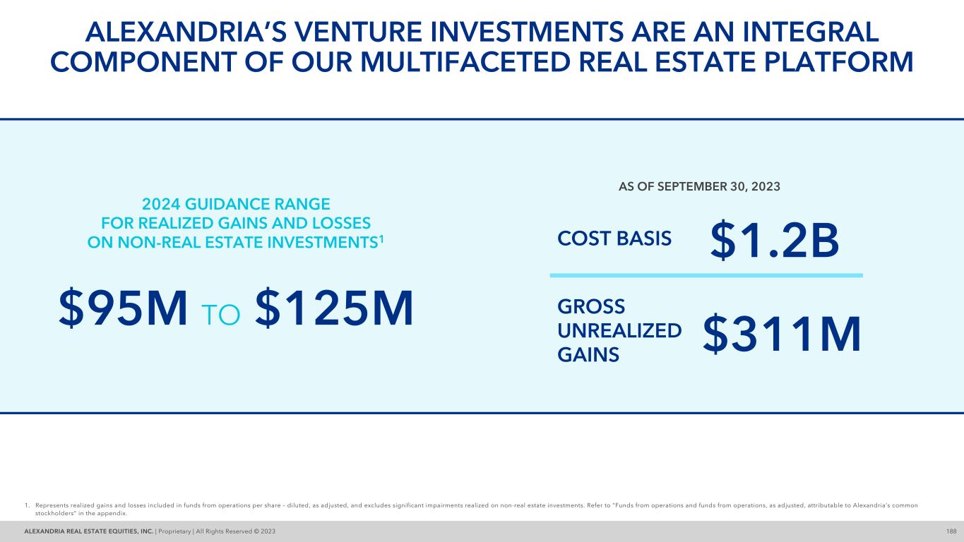 188ALEXANDRIA REAL ESTATE EQUITIES, INC. | Proprietary | All Rights Reserved © 2023 ALEXANDRIA’S VENTURE INVESTMENTS ARE AN INTEGRAL COMPONENT OF OUR MULTIFACETED REAL ESTATE PLATFORM 1. Represents realized gains and losses included in funds from operations per share – diluted, as adjusted, and excludes significant impairments realized on non-real estate investments. Refer to “Funds from operations and funds from operations, as adjusted, attributable to Alexandria’s common stockholders” in the appendix. GROSS UNREALIZED GAINS $311M COST BASIS $1.2B AS OF SEPTEMBER 30, 2023 2024 GUIDANCE RANGE FOR REALIZED GAINS AND LOSSES ON NON-REAL ESTATE INVESTMENTS1 $95M TO $125M