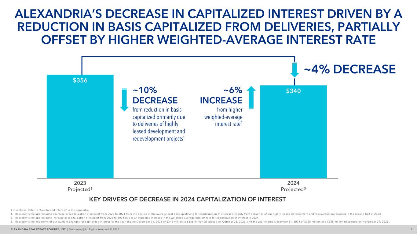 190ALEXANDRIA REAL ESTATE EQUITIES, INC. | Proprietary | All Rights Reserved © 2023 ALEXANDRIA’S DECREASE IN 2024 CAPITALIZATION OF INTEREST ► 2H23 deliveries drive decrease in capitalized interest in 2024 ► Average basis capitalized declines in 2024 ► 2024 construction spend and basis of projects expected to be delivered are roughly equivalent ► Expected increase in weighted- average interest rate in 2024 partially offsets decline in capitalized interest