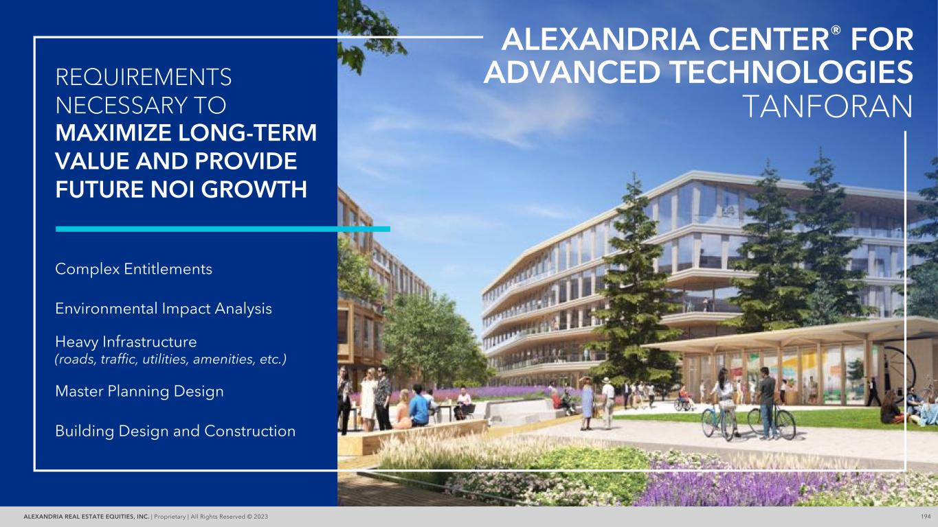 194ALEXANDRIA REAL ESTATE EQUITIES, INC. | Proprietary | All Rights Reserved © 2023 ALEXANDRIA CENTER® FOR ADVANCED TECHNOLOGIES TANFORAN REQUIREMENTS NECESSARY TO MAXIMIZE LONG-TERM VALUE AND PROVIDE FUTURE NOI GROWTH Complex Entitlements Environmental Impact Analysis Heavy Infrastructure (roads, traffic, utilities, amenities, etc.) Master Planning Design Building Design and Construction