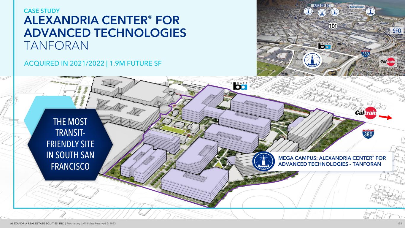 195ALEXANDRIA REAL ESTATE EQUITIES, INC. | Proprietary | All Rights Reserved © 2023 CASE STUDY ALEXANDRIA CENTER® FOR ADVANCED TECHNOLOGIES TANFORAN ACQUIRED IN 2021/2022 | 1.9M FUTURE SF THE MOST TRANSIT- FRIENDLY SITE IN SOUTH SAN FRANCISCO EAST OF 101 SFO MEGA CAMPUS: ALEXANDRIA CENTER® FOR ADVANCED TECHNOLOGIES – TANFORAN