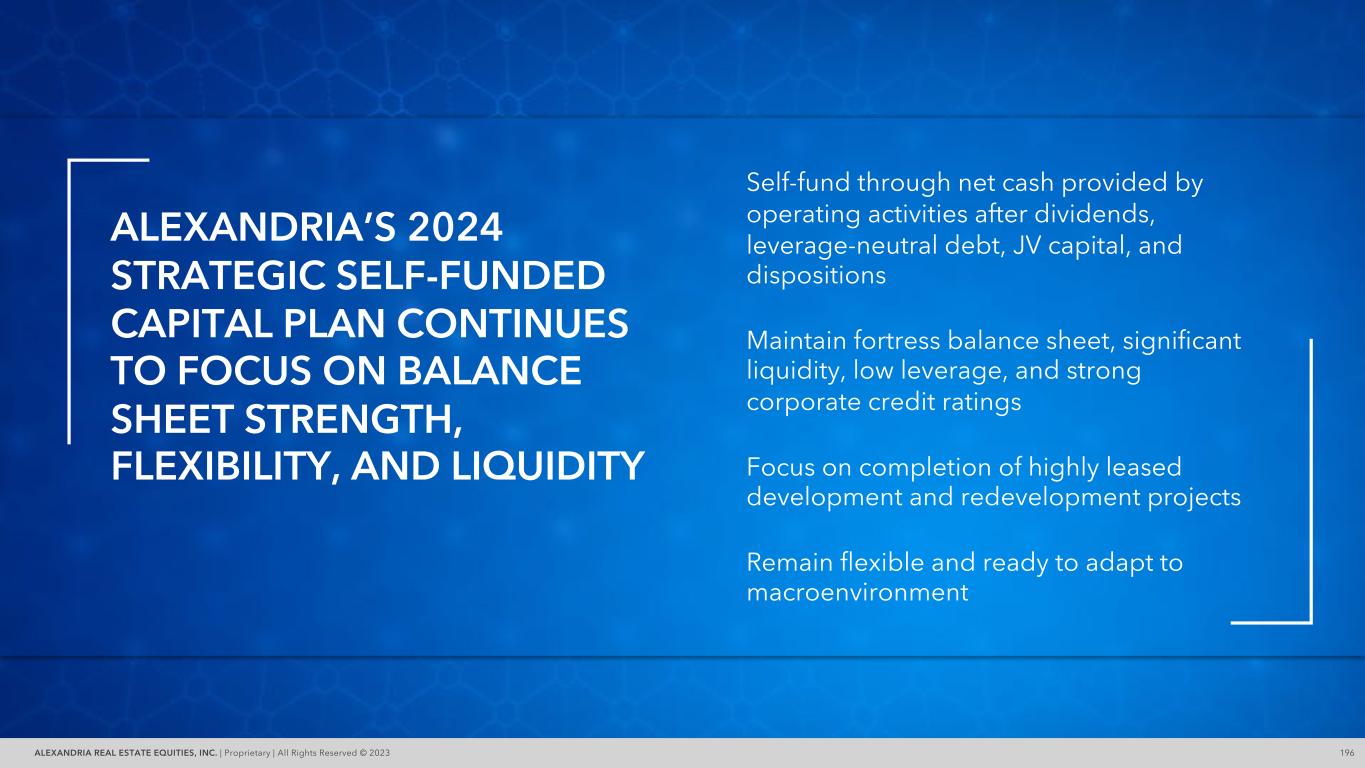 196ALEXANDRIA REAL ESTATE EQUITIES, INC. | Proprietary | All Rights Reserved © 2023 ALEXANDRIA’S 2024 STRATEGIC SELF-FUNDED CAPITAL PLAN CONTINUES TO FOCUS ON BALANCE SHEET STRENGTH, FLEXIBILITY, AND LIQUIDITY Self-fund through net cash provided by operating activities after dividends, leverage-neutral debt, JV capital, and dispositions Maintain fortress balance sheet, significant liquidity, low leverage, and strong corporate credit ratings Focus on completion of highly leased development and redevelopment projects Remain flexible and ready to adapt to macroenvironment
