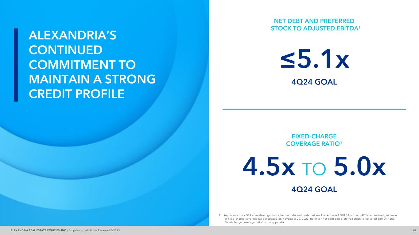 198ALEXANDRIA REAL ESTATE EQUITIES, INC. | Proprietary | All Rights Reserved © 2023 ALEXANDRIA’S CONTINUED COMMITMENT TO MAINTAIN A STRONG CREDIT PROFILE 4Q24 GOAL NET DEBT AND PREFERRED STOCK TO ADJUSTED EBITDA1 ≤5.1x 4.5x TO 5.0x FIXED-CHARGE COVERAGE RATIO1 4Q24 GOAL 1. Represents our 4Q24 annualized guidance for net debt and preferred stock to Adjusted EBITDA and our 4Q24 annualized guidance for fixed-charge coverage ratio disclosed on November 29, 2023. Refer to "Net debt and preferred stock to Adjusted EBITDA" and "Fixed-charge coverage ratio" in the appendix.