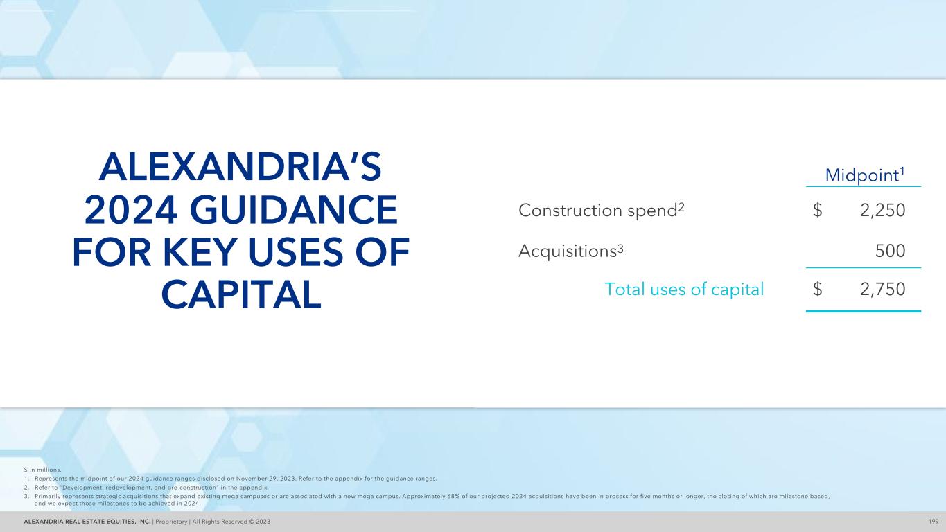 199ALEXANDRIA REAL ESTATE EQUITIES, INC. | Proprietary | All Rights Reserved © 2023 $ in millions. 1. Represents the midpoint of our 2024 guidance ranges disclosed on November 29, 2023. Refer to the appendix for the guidance ranges. 2. Refer to “Development, redevelopment, and pre-construction” in the appendix. 3. Primarily represents strategic acquisitions that expand existing mega campuses or are associated with a new mega campus. Approximately 68% of our projected 2024 acquisitions have been in process for five months or longer, the closing of which are milestone based, and we expect those milestones to be achieved in 2024. Midpoint1 Construction spend2 $ 2,250 Acquisitions3 500 Total uses of capital $ 2,750 ALEXANDRIA’S 2024 GUIDANCE FOR KEY USES OF CAPITAL