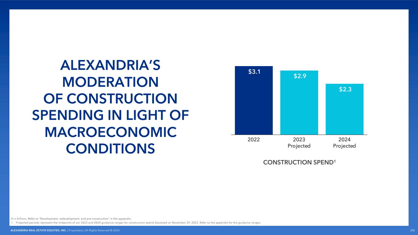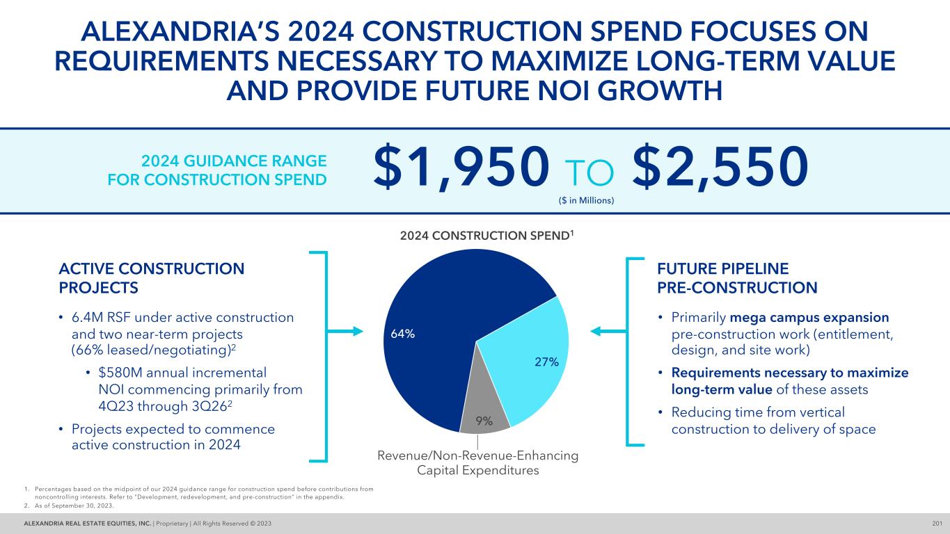 200ALEXANDRIA REAL ESTATE EQUITIES, INC. | Proprietary | All Rights Reserved © 2023 $ in billions. Refer to “Development, redevelopment, and pre-construction” in the appendix. 1. Projected periods represent the midpoints of our 2023 and 2024 guidance ranges for construction spend disclosed on November 29, 2023. Refer to the appendix for the guidance ranges. ALEXANDRIA’S MODERATION OF CONSTRUCTION SPENDING IN LIGHT OF MACROECONOMIC CONDITIONS $3.1 $2.9 $2.3 2022 2023 Projected 2024 Projected CONSTRUCTION SPEND1
