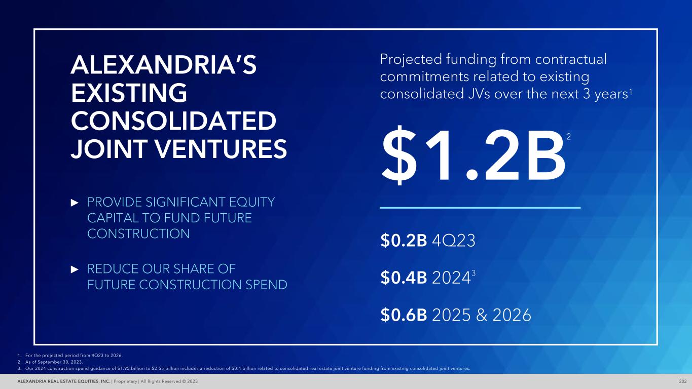 202ALEXANDRIA REAL ESTATE EQUITIES, INC. | Proprietary | All Rights Reserved © 2023 ALEXANDRIA’S EXISTING CONSOLIDATED JOINT VENTURES 1. For the projected period from 4Q23 to 2026. 2. As of September 30, 2023. 3. Our 2024 construction spend guidance of $1.95 billion to $2.55 billion includes a reduction of $0.4 billion related to consolidated real estate joint venture funding from existing consolidated joint ventures. Projected funding from contractual commitments related to existing consolidated JVs over the next 3 years1 $0.2B 4Q23 $0.4B 20243 $0.6B 2025 & 2026 $1.2B2 ► PROVIDE SIGNIFICANT EQUITY CAPITAL TO FUND FUTURE CONSTRUCTION ► REDUCE OUR SHARE OF FUTURE CONSTRUCTION SPEND