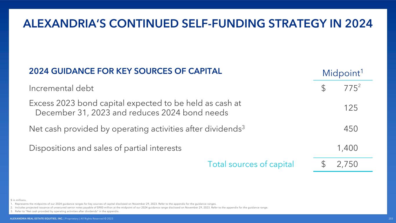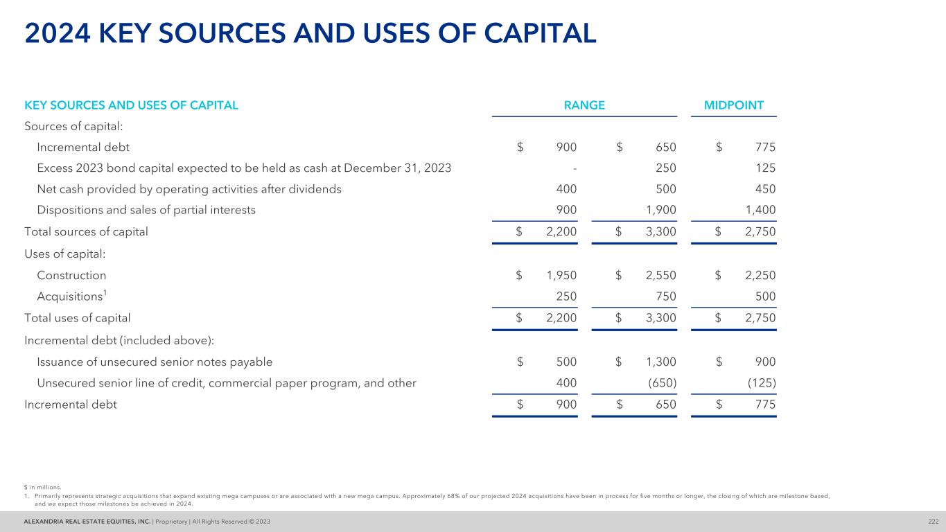 222ALEXANDRIA REAL ESTATE EQUITIES, INC. | Proprietary | All Rights Reserved © 2023 2024 KEY SOURCES AND USES OF CAPITAL KEY SOURCES AND USES OF CAPITAL RANGE MIDPOINT Sources of capital: Incremental debt $ 900 $ 650 $ 775 Excess 2023 bond capital expected to be held as cash at December 31, 2023 - 250 125 Net cash provided by operating activities after dividends 400 500 450 Dispositions and sales of partial interests 900 1,900 1,400 Total sources of capital $ 2,200 $ 3,300 $ 2,750 Uses of capital: Construction $ 1,950 $ 2,550 $ 2,250 Acquisitions1 250 750 500 Total uses of capital $ 2,200 $ 3,300 $ 2,750 Incremental debt (included above): Issuance of unsecured senior notes payable $ 500 $ 1,300 $ 900 Unsecured senior line of credit, commercial paper program, and other 400 (650) (125) Incremental debt $ 900 $ 650 $ 775 $ in millions. 1. Primarily represents strategic acquisitions that expand existing mega campuses or are associated with a new mega campus. Approximately 68% of our projected 2024 acquisitions have been in process for five months or longer, the closing of which are milestone based, and we expect those milestones be achieved in 2024.