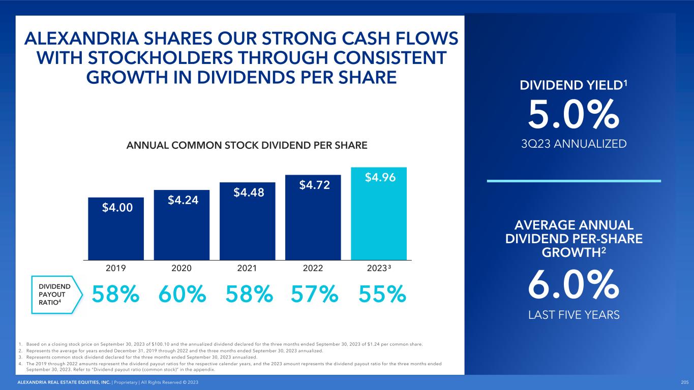 205ALEXANDRIA REAL ESTATE EQUITIES, INC. | Proprietary | All Rights Reserved © 2023 1. Based on a closing stock price on September 30, 2023 of $100.10 and the annualized dividend declared for the three months ended September 30, 2023 of $1.24 per common share. 2. Represents the average for years ended December 31, 2019 through 2022 and the three months ended September 30, 2023 annualized. 3. Represents common stock dividend declared for the three months ended September 30, 2023 annualized. 4. The 2019 through 2022 amounts represent the dividend payout ratios for the respective calendar years, and the 2023 amount represents the dividend payout ratio for the three months ended September 30, 2023. Refer to “Dividend payout ratio (common stock)” in the appendix. ALEXANDRIA SHARES OUR STRONG CASH FLOWS WITH STOCKHOLDERS THROUGH CONSISTENT GROWTH IN DIVIDENDS PER SHARE $4.00 $4.24 $4.48 $4.72 $4.96 2019 2020 2021 2022 2023³ ANNUAL COMMON STOCK DIVIDEND PER SHARE 60% 58% 57%58% 55% 3Q23 ANNUALIZED DIVIDEND PAYOUT RATIO4 DIVIDEND YIELD1 5.0% LAST FIVE YEARS 6.0% AVERAGE ANNUAL DIVIDEND PER-SHARE GROWTH2