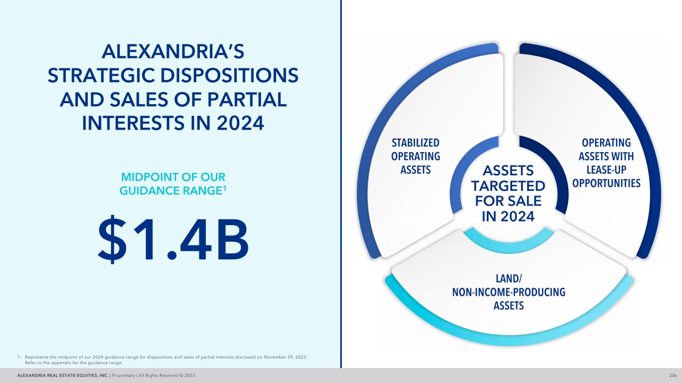 206ALEXANDRIA REAL ESTATE EQUITIES, INC. | Proprietary | All Rights Reserved © 2023 ALEXANDRIA’S STRATEGIC DISPOSITIONS AND SALES OF PARTIAL INTERESTS IN 2024 1. Represents the midpoint of our 2024 guidance range for dispositions and sales of partial interests disclosed on November 29, 2023. Refer to the appendix for the guidance range. MIDPOINT OF OUR GUIDANCE RANGE1 $1.4B ASSETS TARGETED FOR SALE IN 2024 STABILIZED OPERATING ASSETS OPERATING ASSETS WITH LEASE-UP OPPORTUNITIES LAND/ NON-INCOME-PRODUCING ASSETS