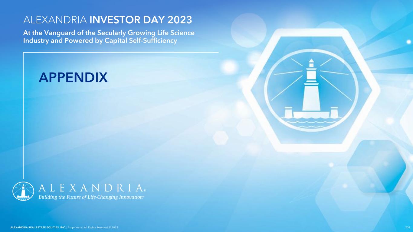 208ALEXANDRIA REAL ESTATE EQUITIES, INC. | Proprietary | All Rights Reserved © 2023 ALEXANDRIA INVESTOR DAY 2023 At the Vanguard of the Secularly Growing Life Science Industry and Powered by Capital Self-Sufficiency APPENDIX