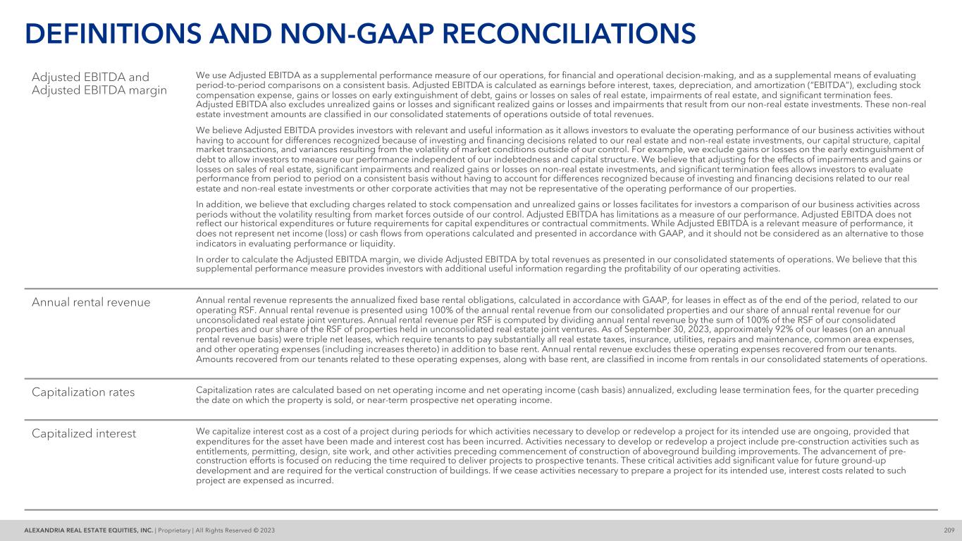 209ALEXANDRIA REAL ESTATE EQUITIES, INC. | Proprietary | All Rights Reserved © 2023 DEFINITIONS AND NON-GAAP RECONCILIATIONS Adjusted EBITDA and Adjusted EBITDA margin We use Adjusted EBITDA as a supplemental performance measure of our operations, for financial and operational decision-making, and as a supplemental means of evaluating period-to-period comparisons on a consistent basis. Adjusted EBITDA is calculated as earnings before interest, taxes, depreciation, and amortization (“EBITDA”), excluding stock compensation expense, gains or losses on early extinguishment of debt, gains or losses on sales of real estate, impairments of real estate, and significant termination fees. Adjusted EBITDA also excludes unrealized gains or losses and significant realized gains or losses and impairments that result from our non-real estate investments. These non-real estate investment amounts are classified in our consolidated statements of operations outside of total revenues. We believe Adjusted EBITDA provides investors with relevant and useful information as it allows investors to evaluate the operating performance of our business activities without having to account for differences recognized because of investing and financing decisions related to our real estate and non-real estate investments, our capital structure, capital market transactions, and variances resulting from the volatility of market conditions outside of our control. For example, we exclude gains or losses on the early extinguishment of debt to allow investors to measure our performance independent of our indebtedness and capital structure. We believe that adjusting for the effects of impairments and gains or losses on sales of real estate, significant impairments and realized gains or losses on non-real estate investments, and significant termination fees allows investors to evaluate performance from period to period on a consistent basis without having to account for differences recognized because of investing and financing decisions related to our real estate and non-real estate investments or other corporate activities that may not be representative of the operating performance of our properties. In addition, we believe that excluding charges related to stock compensation and unrealized gains or losses facilitates for investors a comparison of our business activities across periods without the volatility resulting from market forces outside of our control. Adjusted EBITDA has limitations as a measure of our performance. Adjusted EBITDA does not reflect our historical expenditures or future requirements for capital expenditures or contractual commitments. While Adjusted EBITDA is a relevant measure of performance, it does not represent net income (loss) or cash flows from operations calculated and presented in accordance with GAAP, and it should not be considered as an alternative to those indicators in evaluating performance or liquidity. In order to calculate the Adjusted EBITDA margin, we divide Adjusted EBITDA by total revenues as presented in our consolidated statements of operations. We believe that this supplemental performance measure provides investors with additional useful information regarding the profitability of our operating activities. Annual rental revenue Annual rental revenue represents the annualized fixed base rental obligations, calculated in accordance with GAAP, for leases in effect as of the end of the period, related to our operating RSF. Annual rental revenue is presented using 100% of the annual rental revenue from our consolidated properties and our share of annual rental revenue for our unconsolidated real estate joint ventures. Annual rental revenue per RSF is computed by dividing annual rental revenue by the sum of 100% of the RSF of our consolidated properties and our share of the RSF of properties held in unconsolidated real estate joint ventures. As of September 30, 2023, approximately 92% of our leases (on an annual rental revenue basis) were triple net leases, which require tenants to pay substantially all real estate taxes, insurance, utilities, repairs and maintenance, common area expenses, and other operating expenses (including increases thereto) in addition to base rent. Annual rental revenue excludes these operating expenses recovered from our tenants. Amounts recovered from our tenants related to these operating expenses, along with base rent, are classified in income from rentals in our consolidated statements of operations. Capitalization rates Capitalization rates are calculated based on net operating income and net operating income (cash basis) annualized, excluding lease termination fees, for the quarter preceding the date on which the property is sold, or near-term prospective net operating income. Capitalized interest We capitalize interest cost as a cost of a project during periods for which activities necessary to develop or redevelop a project for its intended use are ongoing, provided that expenditures for the asset have been made and interest cost has been incurred. Activities necessary to develop or redevelop a project include pre-construction activities such as entitlements, permitting, design, site work, and other activities preceding commencement of construction of aboveground building improvements. The advancement of pre- construction efforts is focused on reducing the time required to deliver projects to prospective tenants. These critical activities add significant value for future ground-up development and are required for the vertical construction of buildings. If we cease activities necessary to prepare a project for its intended use, interest costs related to such project are expensed as incurred.