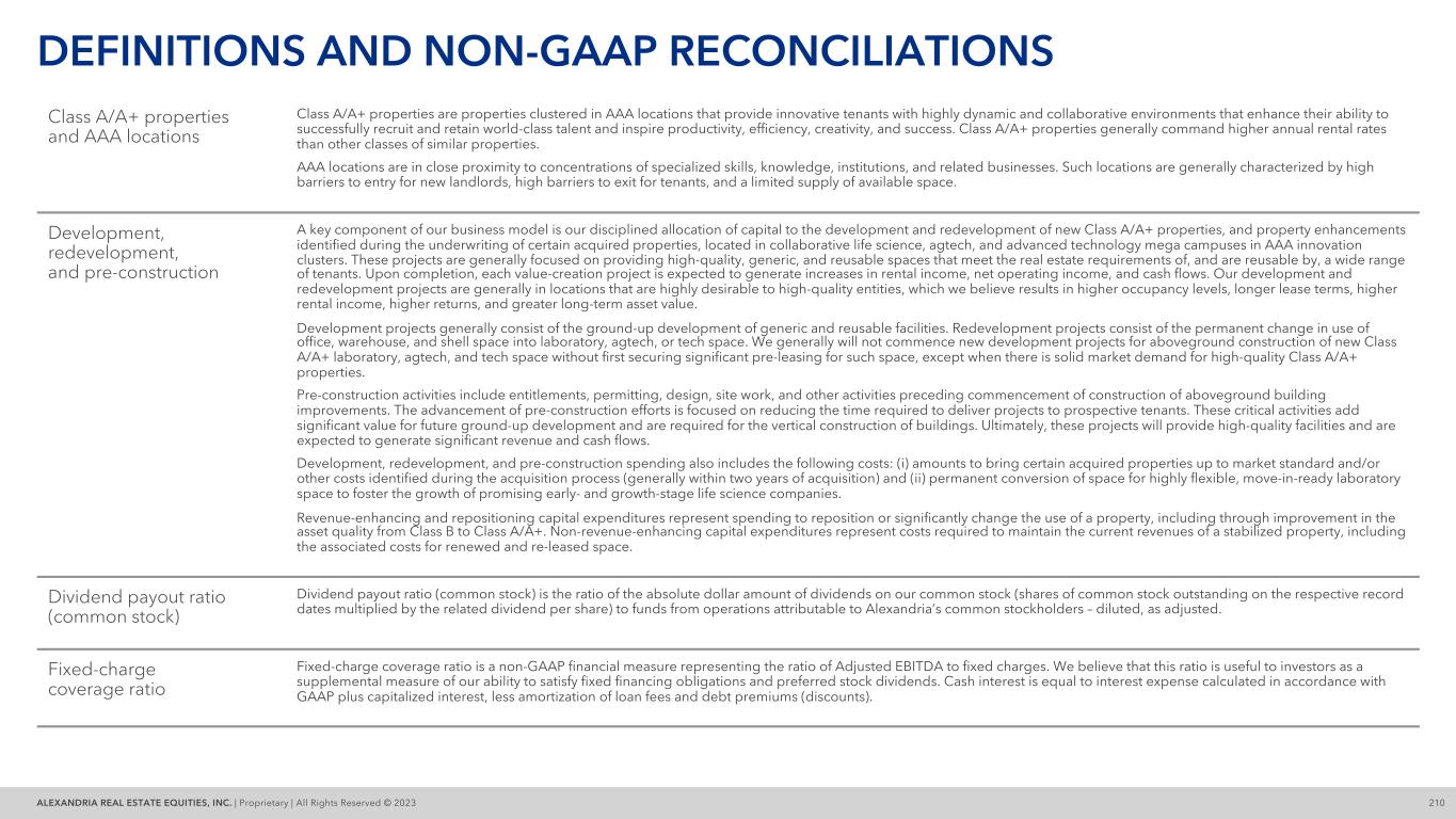 210ALEXANDRIA REAL ESTATE EQUITIES, INC. | Proprietary | All Rights Reserved © 2023 DEFINITIONS AND NON-GAAP RECONCILIATIONS Class A/A+ properties and AAA locations Class A/A+ properties are properties clustered in AAA locations that provide innovative tenants with highly dynamic and collaborative environments that enhance their ability to successfully recruit and retain world-class talent and inspire productivity, efficiency, creativity, and success. Class A/A+ properties generally command higher annual rental rates than other classes of similar properties. AAA locations are in close proximity to concentrations of specialized skills, knowledge, institutions, and related businesses. Such locations are generally characterized by high barriers to entry for new landlords, high barriers to exit for tenants, and a limited supply of available space. Development, redevelopment, and pre-construction A key component of our business model is our disciplined allocation of capital to the development and redevelopment of new Class A/A+ properties, and property enhancements identified during the underwriting of certain acquired properties, located in collaborative life science, agtech, and advanced technology mega campuses in AAA innovation clusters. These projects are generally focused on providing high-quality, generic, and reusable spaces that meet the real estate requirements of, and are reusable by, a wide range of tenants. Upon completion, each value-creation project is expected to generate increases in rental income, net operating income, and cash flows. Our development and redevelopment projects are generally in locations that are highly desirable to high-quality entities, which we believe results in higher occupancy levels, longer lease terms, higher rental income, higher returns, and greater long-term asset value. Development projects generally consist of the ground-up development of generic and reusable facilities. Redevelopment projects consist of the permanent change in use of office, warehouse, and shell space into laboratory, agtech, or tech space. We generally will not commence new development projects for aboveground construction of new Class A/A+ laboratory, agtech, and tech space without first securing significant pre-leasing for such space, except when there is solid market demand for high-quality Class A/A+ properties. Pre-construction activities include entitlements, permitting, design, site work, and other activities preceding commencement of construction of aboveground building improvements. The advancement of pre-construction efforts is focused on reducing the time required to deliver projects to prospective tenants. These critical activities add significant value for future ground-up development and are required for the vertical construction of buildings. Ultimately, these projects will provide high-quality facilities and are expected to generate significant revenue and cash flows. Development, redevelopment, and pre-construction spending also includes the following costs: (i) amounts to bring certain acquired properties up to market standard and/or other costs identified during the acquisition process (generally within two years of acquisition) and (ii) permanent conversion of space for highly flexible, move-in-ready laboratory space to foster the growth of promising early- and growth-stage life science companies. Revenue-enhancing and repositioning capital expenditures represent spending to reposition or significantly change the use of a property, including through improvement in the asset quality from Class B to Class A/A+. Non-revenue-enhancing capital expenditures represent costs required to maintain the current revenues of a stabilized property, including the associated costs for renewed and re-leased space. Dividend payout ratio (common stock) Dividend payout ratio (common stock) is the ratio of the absolute dollar amount of dividends on our common stock (shares of common stock outstanding on the respective record dates multiplied by the related dividend per share) to funds from operations attributable to Alexandria’s common stockholders – diluted, as adjusted. Fixed-charge coverage ratio Fixed-charge coverage ratio is a non-GAAP financial measure representing the ratio of Adjusted EBITDA to fixed charges. We believe that this ratio is useful to investors as a supplemental measure of our ability to satisfy fixed financing obligations and preferred stock dividends. Cash interest is equal to interest expense calculated in accordance with GAAP plus capitalized interest, less amortization of loan fees and debt premiums (discounts).