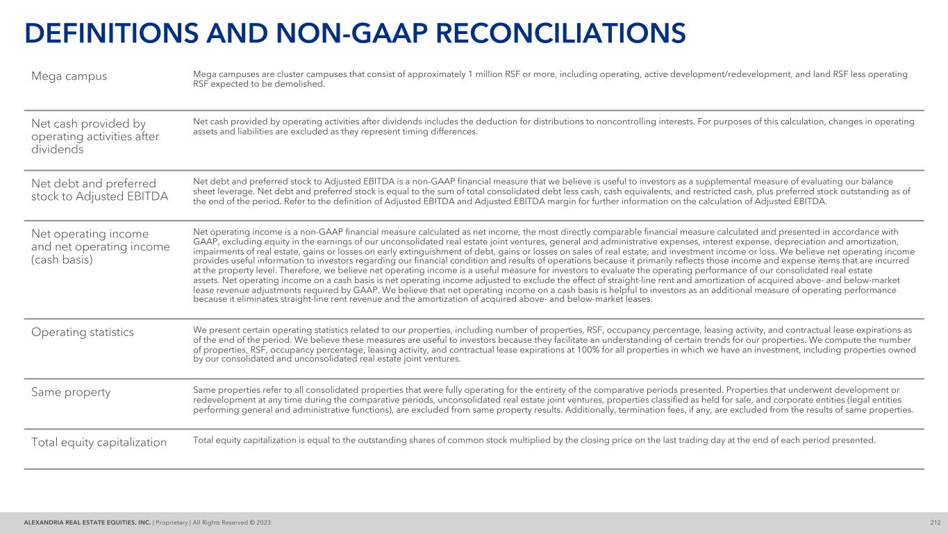 212ALEXANDRIA REAL ESTATE EQUITIES, INC. | Proprietary | All Rights Reserved © 2023 DEFINITIONS AND NON-GAAP RECONCILIATIONS Mega campus Mega campuses are cluster campuses that consist of approximately 1 million RSF or more, including operating, active development/redevelopment, and land RSF less operating RSF expected to be demolished. Net cash provided by operating activities after dividends Net cash provided by operating activities after dividends includes the deduction for distributions to noncontrolling interests. For purposes of this calculation, changes in operating assets and liabilities are excluded as they represent timing differences. Net debt and preferred stock to Adjusted EBITDA Net debt and preferred stock to Adjusted EBITDA is a non-GAAP financial measure that we believe is useful to investors as a supplemental measure of evaluating our balance sheet leverage. Net debt and preferred stock is equal to the sum of total consolidated debt less cash, cash equivalents, and restricted cash, plus preferred stock outstanding as of the end of the period. Refer to the definition of Adjusted EBITDA and Adjusted EBITDA margin for further information on the calculation of Adjusted EBITDA. Net operating income and net operating income (cash basis) Net operating income is a non-GAAP financial measure calculated as net income, the most directly comparable financial measure calculated and presented in accordance with GAAP, excluding equity in the earnings of our unconsolidated real estate joint ventures, general and administrative expenses, interest expense, depreciation and amortization, impairments of real estate, gains or losses on early extinguishment of debt, gains or losses on sales of real estate, and investment income or loss. We believe net operating income provides useful information to investors regarding our financial condition and results of operations because it primarily reflects those income and expense items that are incurred at the property level. Therefore, we believe net operating income is a useful measure for investors to evaluate the operating performance of our consolidated real estate assets. Net operating income on a cash basis is net operating income adjusted to exclude the effect of straight-line rent and amortization of acquired above- and below-market lease revenue adjustments required by GAAP. We believe that net operating income on a cash basis is helpful to investors as an additional measure of operating performance because it eliminates straight-line rent revenue and the amortization of acquired above- and below-market leases. Operating statistics We present certain operating statistics related to our properties, including number of properties, RSF, occupancy percentage, leasing activity, and contractual lease expirations as of the end of the period. We believe these measures are useful to investors because they facilitate an understanding of certain trends for our properties. We compute the number of properties, RSF, occupancy percentage, leasing activity, and contractual lease expirations at 100% for all properties in which we have an investment, including properties owned by our consolidated and unconsolidated real estate joint ventures. Same property Same properties refer to all consolidated properties that were fully operating for the entirety of the comparative periods presented. Properties that underwent development or redevelopment at any time during the comparative periods, unconsolidated real estate joint ventures, properties classified as held for sale, and corporate entities (legal entities performing general and administrative functions), are excluded from same property results. Additionally, termination fees, if any, are excluded from the results of same properties. Total equity capitalization Total equity capitalization is equal to the outstanding shares of common stock multiplied by the closing price on the last trading day at the end of each period presented.