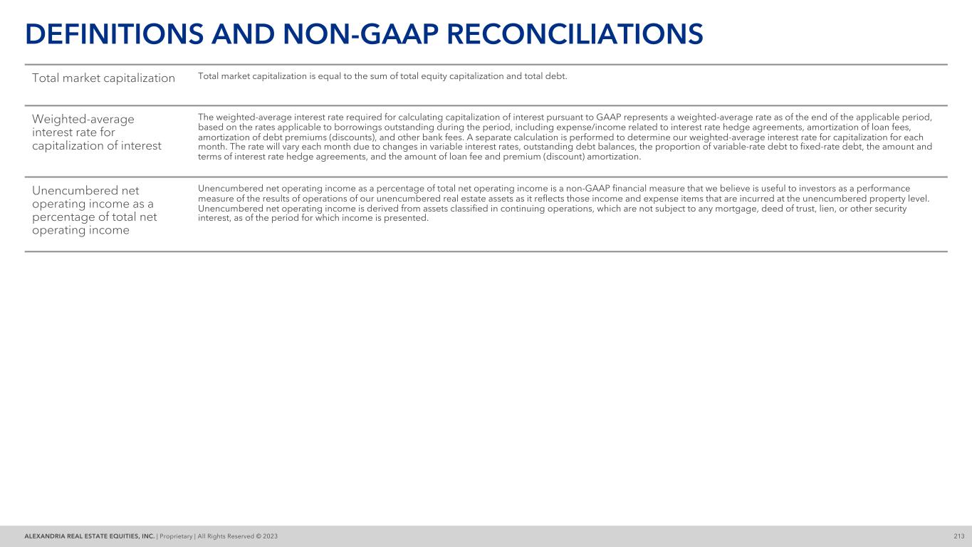 213ALEXANDRIA REAL ESTATE EQUITIES, INC. | Proprietary | All Rights Reserved © 2023 DEFINITIONS AND NON-GAAP RECONCILIATIONS Total market capitalization Total market capitalization is equal to the sum of total equity capitalization and total debt. Weighted-average interest rate for capitalization of interest The weighted-average interest rate required for calculating capitalization of interest pursuant to GAAP represents a weighted-average rate as of the end of the applicable period, based on the rates applicable to borrowings outstanding during the period, including expense/income related to interest rate hedge agreements, amortization of loan fees, amortization of debt premiums (discounts), and other bank fees. A separate calculation is performed to determine our weighted-average interest rate for capitalization for each month. The rate will vary each month due to changes in variable interest rates, outstanding debt balances, the proportion of variable-rate debt to fixed-rate debt, the amount and terms of interest rate hedge agreements, and the amount of loan fee and premium (discount) amortization. Unencumbered net operating income as a percentage of total net operating income Unencumbered net operating income as a percentage of total net operating income is a non-GAAP financial measure that we believe is useful to investors as a performance measure of the results of operations of our unencumbered real estate assets as it reflects those income and expense items that are incurred at the unencumbered property level. Unencumbered net operating income is derived from assets classified in continuing operations, which are not subject to any mortgage, deed of trust, lien, or other security interest, as of the period for which income is presented.