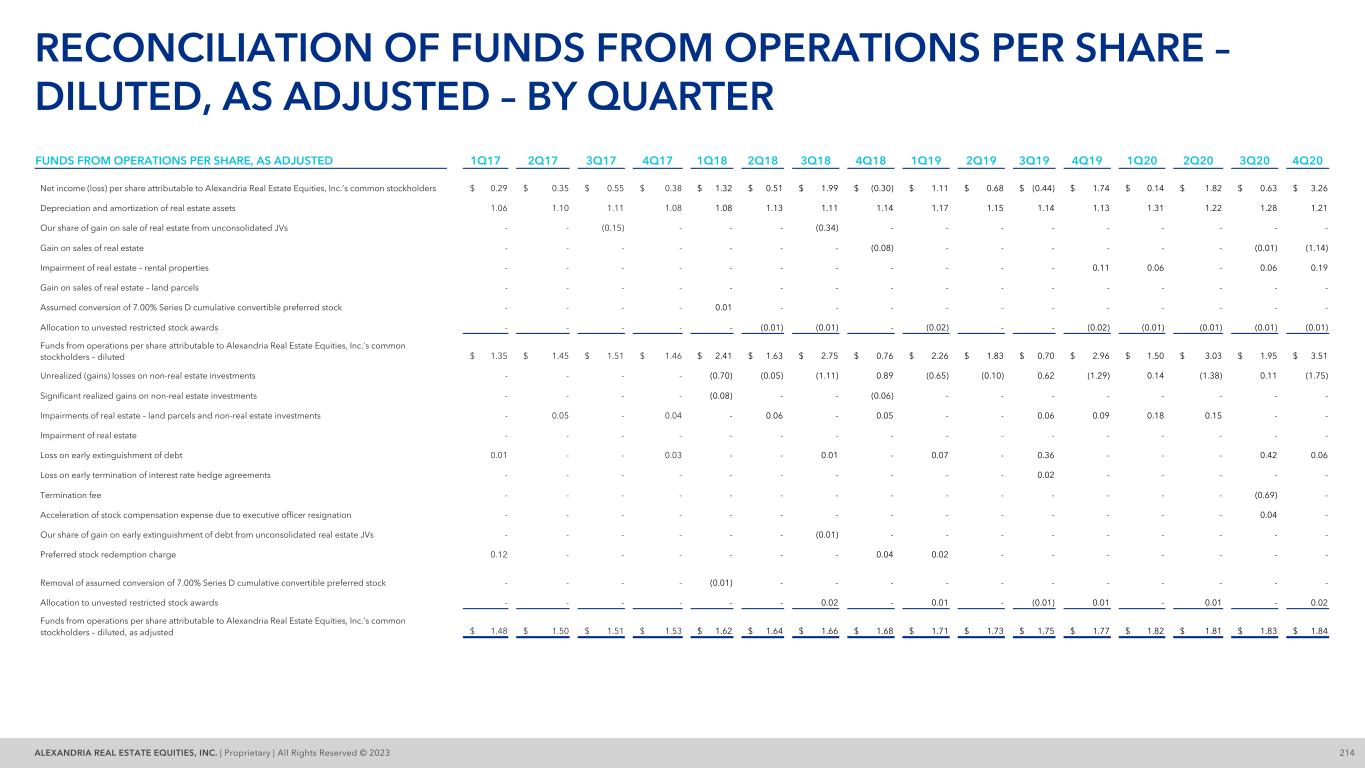 214ALEXANDRIA REAL ESTATE EQUITIES, INC. | Proprietary | All Rights Reserved © 2023 RECONCILIATION OF FUNDS FROM OPERATIONS PER SHARE – DILUTED, AS ADJUSTED – BY QUARTER FUNDS FROM OPERATIONS PER SHARE, AS ADJUSTED 1Q17 2Q17 3Q17 4Q17 1Q18 2Q18 3Q18 4Q18 1Q19 2Q19 3Q19 4Q19 1Q20 2Q20 3Q20 4Q20 Net income (loss) per share attributable to Alexandria Real Estate Equities, Inc.’s common stockholders $ 0.29 $ 0.35 $ 0.55 $ 0.38 $ 1.32 $ 0.51 $ 1.99 $ (0.30) $ 1.11 $ 0.68 $ (0.44) $ 1.74 $ 0.14 $ 1.82 $ 0.63 $ 3.26 Depreciation and amortization of real estate assets 1.06 1.10 1.11 1.08 1.08 1.13 1.11 1.14 1.17 1.15 1.14 1.13 1.31 1.22 1.28 1.21 Our share of gain on sale of real estate from unconsolidated JVs - - (0.15) - - - (0.34) - - - - - - - - - Gain on sales of real estate - - - - - - - (0.08) - - - - - - (0.01) (1.14) Impairment of real estate – rental properties - - - - - - - - - - - 0.11 0.06 - 0.06 0.19 Gain on sales of real estate – land parcels - - - - - - - - - - - - - - - - Assumed conversion of 7.00% Series D cumulative convertible preferred stock - - - - 0.01 - - - - - - - - - - - Allocation to unvested restricted stock awards - - - - - (0.01) (0.01) - (0.02) - - (0.02) (0.01) (0.01) (0.01) (0.01) Funds from operations per share attributable to Alexandria Real Estate Equities, Inc.’s common stockholders – diluted $ 1.35 $ 1.45 $ 1.51 $ 1.46 $ 2.41 $ 1.63 $ 2.75 $ 0.76 $ 2.26 $ 1.83 $ 0.70 $ 2.96 $ 1.50 $ 3.03 $ 1.95 $ 3.51 Unrealized (gains) losses on non-real estate investments - - - - (0.70) (0.05) (1.11) 0.89 (0.65) (0.10) 0.62 (1.29) 0.14 (1.38) 0.11 (1.75) Significant realized gains on non-real estate investments - - - - (0.08) - - (0.06) - - - - - - - - Impairments of real estate – land parcels and non-real estate investments - 0.05 - 0.04 - 0.06 - 0.05 - - 0.06 0.09 0.18 0.15 - - Impairment of real estate - - - - - - - - - - - - - - - - Loss on early extinguishment of debt 0.01 - - 0.03 - - 0.01 - 0.07 - 0.36 - - - 0.42 0.06 Loss on early termination of interest rate hedge agreements - - - - - - - - - - 0.02 - - - - - Termination fee - - - - - - - - - - - - - - (0.69) - Acceleration of stock compensation expense due to executive officer resignation - - - - - - - - - - - - - - 0.04 - Our share of gain on early extinguishment of debt from unconsolidated real estate JVs - - - - - - (0.01) - - - - - - - - - Preferred stock redemption charge 0.12 - - - - - - 0.04 0.02 - - - - - - - Removal of assumed conversion of 7.00% Series D cumulative convertible preferred stock - - - - (0.01) - - - - - - - - - - - Allocation to unvested restricted stock awards - - - - - - 0.02 - 0.01 - (0.01) 0.01 - 0.01 - 0.02 Funds from operations per share attributable to Alexandria Real Estate Equities, Inc.’s common stockholders – diluted, as adjusted $ 1.48 $ 1.50 $ 1.51 $ 1.53 $ 1.62 $ 1.64 $ 1.66 $ 1.68 $ 1.71 $ 1.73 $ 1.75 $ 1.77 $ 1.82 $ 1.81 $ 1.83 $ 1.84