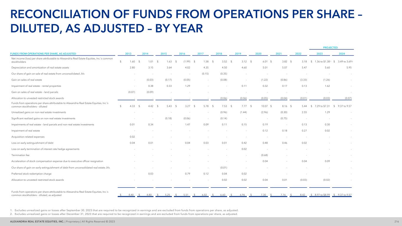 215ALEXANDRIA REAL ESTATE EQUITIES, INC. | Proprietary | All Rights Reserved © 2023 RECONCILIATION OF FUNDS FROM OPERATIONS PER SHARE – DILUTED, AS ADJUSTED – BY QUARTER FUNDS FROM OPERATIONS PER SHARE, AS ADJUSTED 1Q21 2Q21 3Q21 4Q21 1Q22 2Q22 3Q22 4Q22 1Q23 2Q23 3Q23 Net income (loss) per share attributable to Alexandria Real Estate Equities, Inc.’s common stockholders $ 0.04 $ 2.61 $ 0.67 $ 0.47 $ (0.96) $ 1.67 $ 2.11 $ 0.31 $ 0.44 $ 0.51 $ 0.13 Depreciation and amortization of real estate assets 1.20 1.19 1.26 1.40 1.36 1.32 1.39 1.41 1.38 1.42 1.40 Our share of gain on sale of real estate from unconsolidated JVs - - - - - - - - - - - Gain on sales of real estate (0.02) - - (0.80) - (1.33) (2.00) - - (1.26) - Impairment of real estate – rental properties 0.04 0.01 0.12 - - - - 0.13 - 0.98 0.12 Gain on sales of real estate – land parcels - - - - - - - - - - - Assumed conversion of 7.00% Series D cumulative convertible preferred stock - - - - - - - - - - - Allocation to unvested restricted stock awards - (0.01) (0.01) - - - 0.01 (0.01) (0.01) (0.01) (0.01) Funds from operations per share attributable to Alexandria Real Estate Equities, Inc.’s common stockholders – diluted $ 1.26 $ 3.80 $ 2.04 $ 1.07 $ 0.40 $ 1.66 $ 1.51 $ 1.84 $ 1.81 $ 1.64 $ 1.64 Unrealized (gains) losses on non-real estate investments 0.34 (1.67) 0.10 0.91 1.67 0.42 0.35 0.15 0.39 0.46 0.45 Significant realized gains on non-real estate investments (0.17) (0.24) (0.35) - - - - - - - - Impairments of real estate – land parcels and non-real estate investments - - - - - - - 0.12 - 0.13 0.17 Impairment of real estate - 0.02 0.16 - - - 0.24 0.03 - 0.02 - Loss on early extinguishment of debt 0.49 - - - - 0.02 - - - - - Loss on early termination of interest rate hedge agreements - - - - - - - - - - - Termination fee - - - - - - - - - - - Acceleration of stock compensation expense due to executive officer resignation - - - - - - 0.04 - - - 0.01 Our share of gain on early extinguishment of debt from unconsolidated real estate JVs - - - - - - - - - - - Preferred stock redemption charge - - - - - - - - - - - Removal of assumed conversion of 7.00% Series D cumulative convertible preferred stock - - - - - - - - - - - Allocation to unvested restricted stock awards (0.01) 0.02 - (0.01) (0.02) - (0.01) - (0.01) (0.01) (0.01) Funds from operations per share attributable to Alexandria Real Estate Equities, Inc.’s common stockholders – diluted, as adjusted $ 1.91 $ 1.93 $ 1.95 $ 1.97 $ 2.05 $ 2.10 $ 2.13 $ 2.14 $ 2.19 $ 2.24 $ 2.26