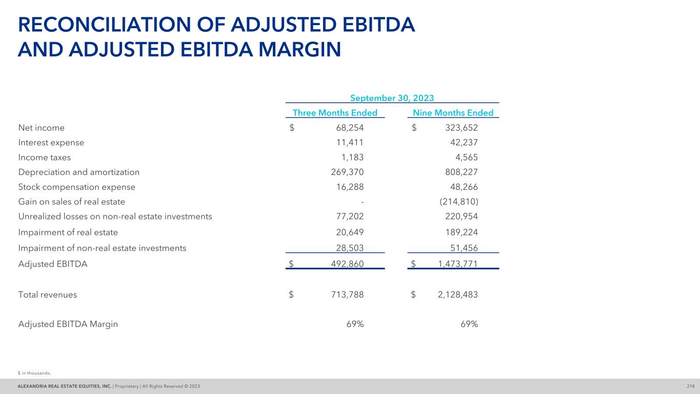 217ALEXANDRIA REAL ESTATE EQUITIES, INC. | Proprietary | All Rights Reserved © 2023 RECONCILIATION OF NET OPERATING INCOME AND NET OPERATING INCOME (CASH BASIS) 2014 2015 2016 2017 2018 2019 2020 2021 2022 YTD 3Q23 ANNUALIZED Net income (loss) $ 106,778 $ 146,114 $ (49,799) $ 194,204 $ 402,793 $ 404,047 $ 827,171 $ 654,282 $ 670,701 $ 431,536 Equity in (earnings) losses of unconsolidated real estate joint ventures (554) (1,651) 184 (15,426) (43,981) (10,136) (8,148) (12,255) (645) (823) General and administrative expenses 53,530 59,621 63,884 75,009 90,405 108,823 133,341 151,461 177,278 186,753 Interest expense 79,299 105,813 106,953 128,645 157,495 173,675 171,609 142,165 94,203 56,316 Depreciation and amortization 224,096 261,289 313,390 416,783 477,661 544,612 698,104 821,061 1,002,146 1,077,636 Impairment of real estate 51,675 23,250 209,261 203 6,311 12,334 48,078 52,675 64,969 252,299 Loss on early extinguishment of debt 525 189 3,230 3,451 1,122 47,570 60,668 67,253 3,317 - Gain on sales of real estate - rental properties - (12,426) (3,715) (270) (8,704) (474) (154,089) (126,570) (537,918) (286,413) Gain on sales of real estate - land parcels (6,403) - (90) (111) - - - - - - Investment (income) loss - - - - (136,763) (194,647) (421,321) (259,477) 331,758 272,068 (Income) loss from discontinued operations, net (1,233) 43 - - - - - - - - Net operating income $ 507,713 $ 582,242 $ 643,298 $ 802,488 $ 946,339 $ 1,085,804 $ 1,355,413 $ 1,490,595 $ 1,805,809 $ 1,989,372 Straight-line rent revenue (45,534) (50,379) (51,672) (107,643) (93,883) (104,235) (96,676) (115,145) (118,003) (123,108) Amortization of acquired below-market leases (2,845) (6,118) (5,723) (19,055) (21,938) (29,813) (57,244) (54,780) (74,346) (92,863) Net operating income (cash basis) $ 459,334 $ 525,745 $ 585,903 $ 675,790 $ 830,518 $ 951,756 $ 1,201,493 $ 1,320,670 $ 1,613,460 $ 1,773,401 $ in thousands.