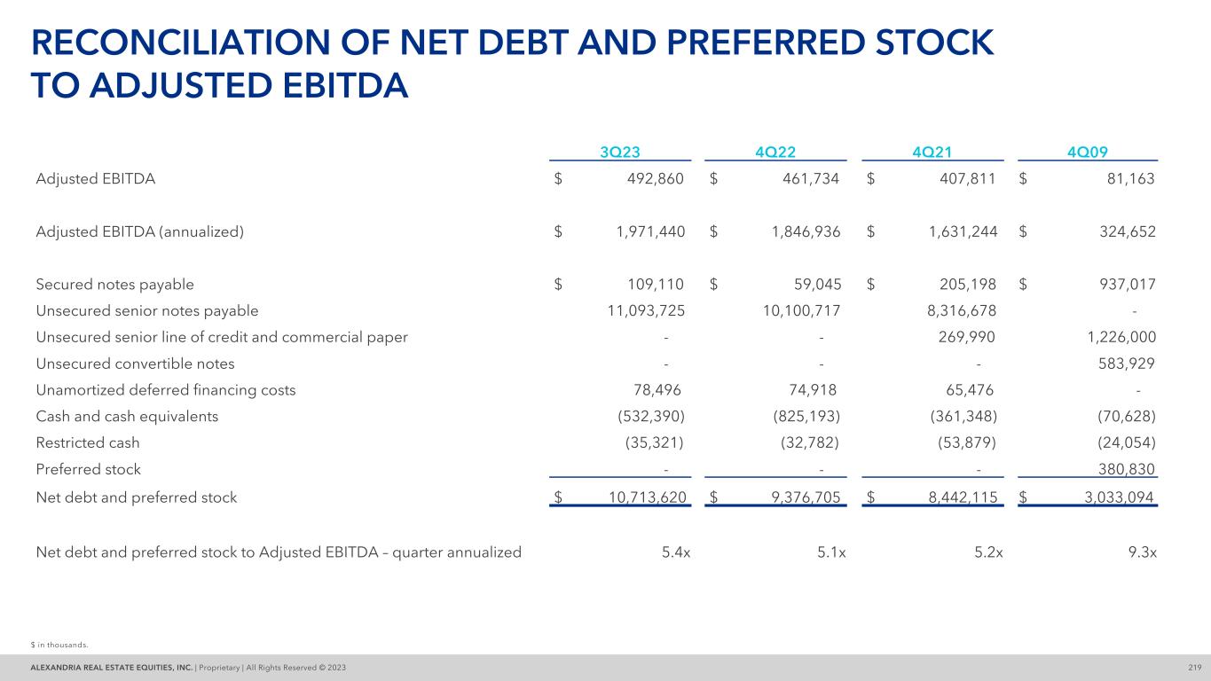219ALEXANDRIA REAL ESTATE EQUITIES, INC. | Proprietary | All Rights Reserved © 2023 RECONCILIATION OF NET DEBT AND PREFERRED STOCK TO ADJUSTED EBITDA 3Q23 4Q22 4Q21 4Q09 Adjusted EBITDA $ 492,860 $ 461,734 $ 407,811 $ 81,163 Adjusted EBITDA (annualized) $ 1,971,440 $ 1,846,936 $ 1,631,244 $ 324,652 Secured notes payable $ 109,110 $ 59,045 $ 205,198 $ 937,017 Unsecured senior notes payable 11,093,725 10,100,717 8,316,678 - Unsecured senior line of credit and commercial paper - - 269,990 1,226,000 Unsecured convertible notes - - - 583,929 Unamortized deferred financing costs 78,496 74,918 65,476 - Cash and cash equivalents (532,390) (825,193) (361,348) (70,628) Restricted cash (35,321) (32,782) (53,879) (24,054) Preferred stock - - - 380,830 Net debt and preferred stock $ 10,713,620 $ 9,376,705 $ 8,442,115 $ 3,033,094 Net debt and preferred stock to Adjusted EBITDA – quarter annualized 5.4x 5.1x 5.2x 9.3x $ in thousands.