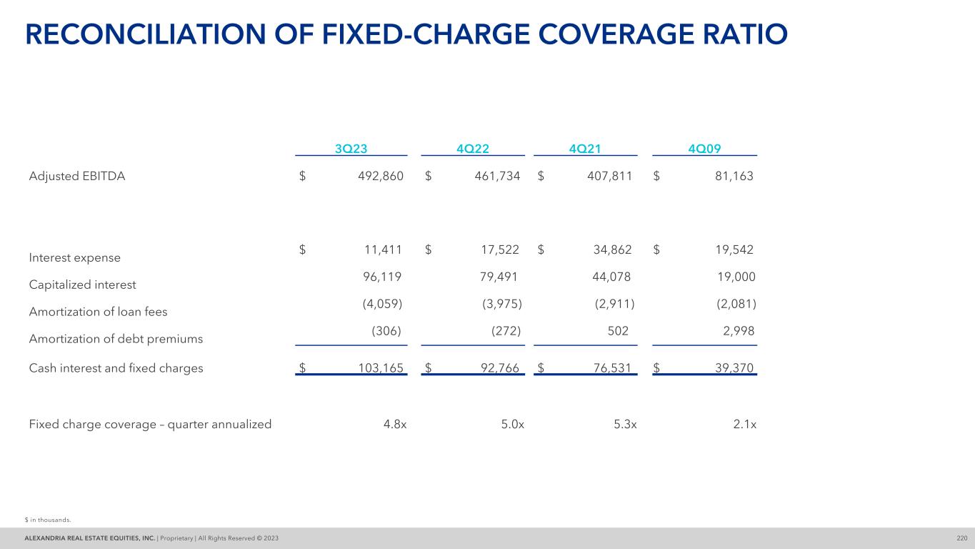 220ALEXANDRIA REAL ESTATE EQUITIES, INC. | Proprietary | All Rights Reserved © 2023 RECONCILIATION OF FIXED-CHARGE COVERAGE RATIO 3Q23 4Q22 4Q21 4Q09 Adjusted EBITDA $ 492,860 $ 461,734 $ 407,811 $ 81,163 Interest expense $ 11,411 $ 17,522 $ 34,862 $ 19,542 Capitalized interest 96,119 79,491 44,078 19,000 Amortization of loan fees (4,059) (3,975) (2,911) (2,081) Amortization of debt premiums (306) (272) 502 2,998 Cash interest and fixed charges $ 103,165 $ 92,766 $ 76,531 $ 39,370 Fixed charge coverage – quarter annualized 4.8x 5.0x 5.3x 2.1x $ in thousands.