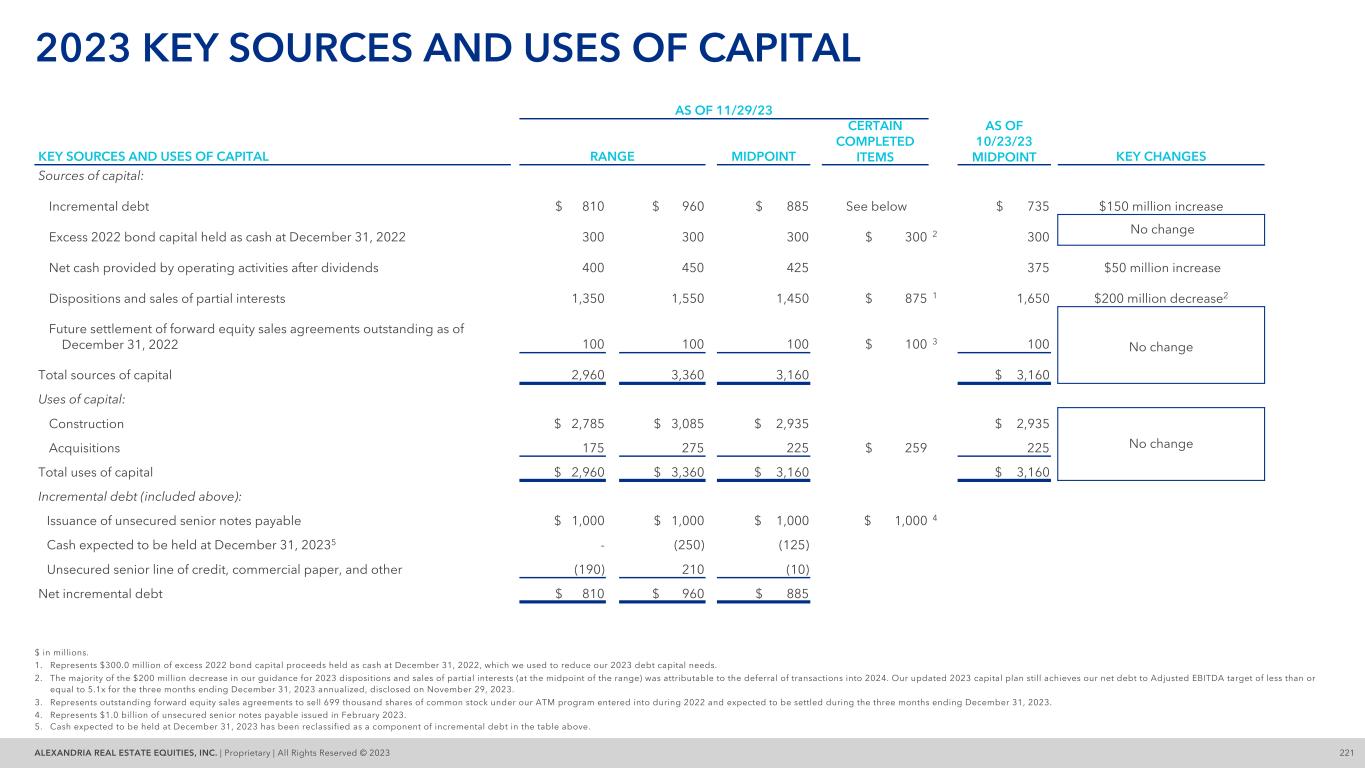 221ALEXANDRIA REAL ESTATE EQUITIES, INC. | Proprietary | All Rights Reserved © 2023 2023 KEY SOURCES AND USES OF CAPITAL $ in millions. 1. Represents $300.0 million of excess 2022 bond capital proceeds held as cash at December 31, 2022, which we used to reduce our 2023 debt capital needs. 2. The majority of the $200 million decrease in our guidance for 2023 dispositions and sales of partial interests (at the midpoint of the range) was attributable to the deferral of transactions into 2024. Our updated 2023 capital plan still achieves our net debt to Adjusted EBITDA target of less than or equal to 5.1x for the three months ending December 31, 2023 annualized, disclosed on November 29, 2023. 3. Represents outstanding forward equity sales agreements to sell 699 thousand shares of common stock under our ATM program entered into during 2022 and expected to be settled during the three months ending December 31, 2023. 4. Represents $1.0 billion of unsecured senior notes payable issued in February 2023. 5. Cash expected to be held at December 31, 2023 has been reclassified as a component of incremental debt in the table above. AS OF 11/29/23 AS OF 10/23/23 MIDPOINT KEY CHANGESKEY SOURCES AND USES OF CAPITAL RANGE MIDPOINT CERTAIN COMPLETED ITEMS Sources of capital: Incremental debt $ 810 $ 960 $ 885 See below $ 735 $150 million increase Excess 2022 bond capital held as cash at December 31, 2022 300 300 300 $ 300 2 300 No change Net cash provided by operating activities after dividends 400 450 425 375 $50 million increase Dispositions and sales of partial interests 1,350 1,550 1,450 $ 875 1 1,650 $200 million decrease2 Future settlement of forward equity sales agreements outstanding as of December 31, 2022 100 100 100 $ 100 3 100 No change Total sources of capital 2,960 3,360 3,160 $ 3,160 Uses of capital: Construction $ 2,785 $ 3,085 $ 2,935 $ 2,935 No changeAcquisitions 175 275 225 $ 259 225 Total uses of capital $ 2,960 $ 3,360 $ 3,160 $ 3,160 Incremental debt (included above): Issuance of unsecured senior notes payable $ 1,000 $ 1,000 $ 1,000 $ 1,000 4 Cash expected to be held at December 31, 20235 - (250) (125) Unsecured senior line of credit, commercial paper, and other (190) 210 (10) Net incremental debt $ 810 $ 960 $ 885