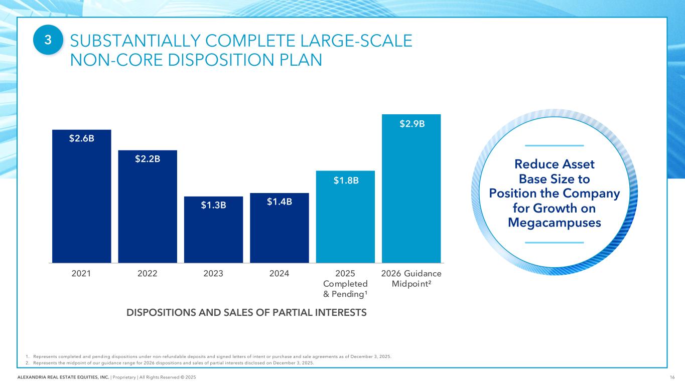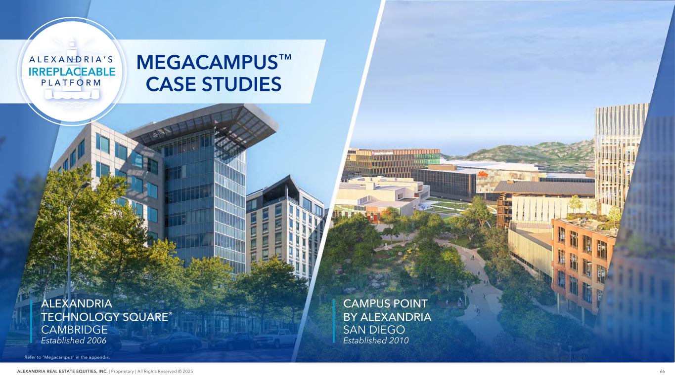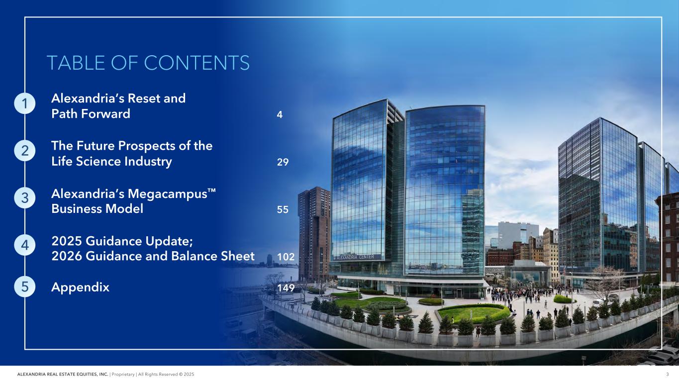2ALEXANDRIA REAL ESTATE EQUITIES, INC. | Proprietary | All Rights Reserved © 2025 Safe Harbor Alexandria®, Lighthouse Design® logo, Building the Future of Life-Changing Innovation®, Megacampus™, Alexandria Center®, Alexandria Technology Center®, Alexandria Technology Square®, and The Miracle Mile of Medicine™ are copyrights and trademarks of Alexandria Real Estate Equities, Inc. All other company names, trademarks, and logos referenced herein are the property of their respective owners. This presentation contains forward-looking non-GAAP financial measures, including funds from operations, per share – diluted, as adjusted. We do not provide guidance for the most comparable GAAP financial measure or a reconciliation of the forward-looking non-GAAP financial measure of funds from operations, as adjusted, because we are unable to reasonably predict, without unreasonable effort, certain items that would be contained in the comparable GAAP measure, including items that are not indicative of our ongoing operations, such as, without limitation, unrealized gains or losses on non-real estate investments, potential impairments of real estate assets, and gains or losses on sales of real estate. These items are uncertain, depend on various factors, and could have a material impact on our GAAP results for the guidance periods. This presentation includes “forward-looking statements” within the meaning of Section 27A of the Securities Act of 1933, as amended, and Section 21E of the Securities Exchange Act of 1934, as amended. Such forward-looking statements include, without limitation, statements regarding our projected earnings per share attributable to Alexandria’s common stockholders – diluted, funds from operations per share attributable to Alexandria’s common stockholders – diluted, net operating income, sources and uses of capital, and targets and timing for rental revenues and development and value-creation projects, expenses, capital plan strategy, risk management strategy and related actions, and environmental, social, and governance goals. You can identify the forward-looking statements by their use of forward-looking words, such as “forecast,” “guidance,” “goals,” “projects,” “estimates,” “anticipates,” “believes,” “expects,” “intends,” “may,” “plans,” “seeks,” “should,” “targets,” or “will,” or the negative of those words or similar words. These forward-looking statements are based on our current expectations, beliefs, projections, future plans and strategies, anticipated events or trends, and similar expressions concerning matters that are not historical facts, as well as a number of assumptions concerning future events. There can be no assurance that actual results will not be materially higher or lower than these expectations. These statements are subject to risks, uncertainties, assumptions, and other important factors that could cause actual results to differ materially from the results discussed in the forward-looking statements. Factors that might cause such a difference include, without limitation, our failure to obtain capital (debt, construction financing, and/or equity) or refinance debt maturities, lower than expected yields, increased interest rates and construction and operating costs, adverse economic or real estate developments in our markets, greater than expected losses on disposition of properties, our failure to successfully place into service and lease any properties undergoing development or redevelopment and our existing space held for future development or redevelopment (including new properties acquired for that purpose), our failure to successfully operate or lease acquired or existing properties, decreased rental rates, increased vacancy rates or failure to renew or replace expiring leases, defaults on or non-renewal of leases by tenants, adverse general and local economic conditions, an unfavorable capital market environment, volatile, unfavorable, or uncertain social and political conditions (including the effects of new laws, regulations, and policies), decreased leasing activity or lease renewals, failure to obtain LEED and other healthy building certifications and efficiencies, and other risks and uncertainties detailed in our filings with the Securities and Exchange Commission (“SEC”). Accordingly, you are cautioned not to place undue reliance on such forward-looking statements. Other than as may be required by law, we assume no obligation to update this information and expressly disclaim any obligation to update or revise any forward-looking statements, whether as a result of new information, future events, or otherwise. For more discussion relating to risks and uncertainties that could cause actual results to differ materially from those anticipated in our forward-looking statements, and risks to our business in general, please refer to our SEC filings, including our most recent annual report on Form 10-K and any subsequent quarterly reports on Form 10-Q.