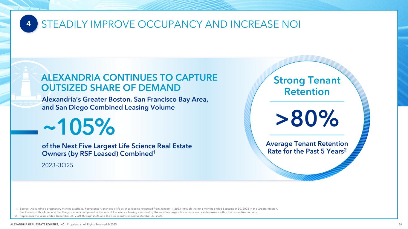 19ALEXANDRIA REAL ESTATE EQUITIES, INC. | Proprietary | All Rights Reserved © 2025 As of September 30, 2025. Refer to “Annual rental revenue” and “Net operating income, net operating income (cash basis), and operating margin” in the appendix. 1. Represents the percentage of our annual rental revenue generated by professional services, finance, telecommunications, construction/real estate companies, and retail-related tenants. 2. 68% of our annual rental revenue from advanced technologies tenants is from investment-grade or publicly traded large cap tenants. 3. 80% of our annual rental revenue from biomedical institutions is from investment-grade or publicly traded large cap tenants. STEADILY IMPROVE OCCUPANCY AND INCREASE NOI4 Public Biotechnology – Approved or Marketed Product 20% 11% 9% 13% 10%1% 10% 3% 23% Biomedical Institutions3 Life Science Product, Service, and Device Public Biotechnology – Preclinical or Clinical Stage Private Biotechnology Other1 Government Institutions Advanced Technologies2 PERCENTAGE OF ARE’S ANNUAL RENTAL REVENUE Focusing on All Sectors of Our Tenant Base, INCLUDING THE MOST INNOVATIVE ENTITIES IN A RAPIDLY CHANGING ENVIRONMENT Multinational Pharmaceutical