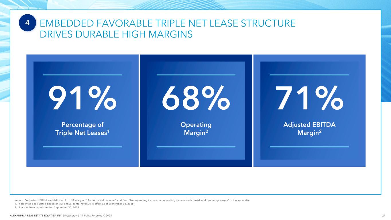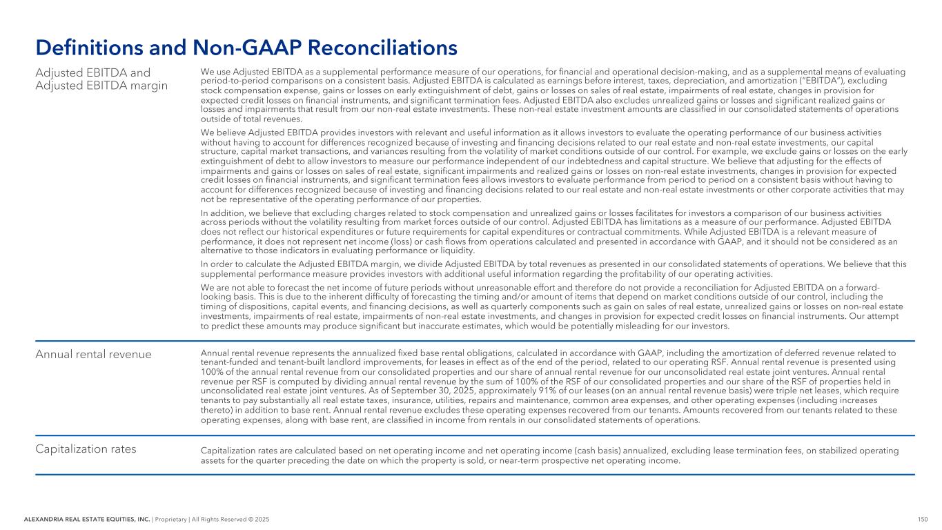 150ALEXANDRIA REAL ESTATE EQUITIES, INC. | Proprietary | All Rights Reserved © 2025 Definitions and Non-GAAP Reconciliations Adjusted EBITDA and Adjusted EBITDA margin We use Adjusted EBITDA as a supplemental performance measure of our operations, for financial and operational decision-making, and as a supplemental means of evaluating period-to-period comparisons on a consistent basis. Adjusted EBITDA is calculated as earnings before interest, taxes, depreciation, and amortization (“EBITDA”), excluding stock compensation expense, gains or losses on early extinguishment of debt, gains or losses on sales of real estate, impairments of real estate, changes in provision for expected credit losses on financial instruments, and significant termination fees. Adjusted EBITDA also excludes unrealized gains or losses and significant realized gains or losses and impairments that result from our non-real estate investments. These non-real estate investment amounts are classified in our consolidated statements of operations outside of total revenues. We believe Adjusted EBITDA provides investors with relevant and useful information as it allows investors to evaluate the operating performance of our business activities without having to account for differences recognized because of investing and financing decisions related to our real estate and non-real estate investments, our capital structure, capital market transactions, and variances resulting from the volatility of market conditions outside of our control. For example, we exclude gains or losses on the early extinguishment of debt to allow investors to measure our performance independent of our indebtedness and capital structure. We believe that adjusting for the effects of impairments and gains or losses on sales of real estate, significant impairments and realized gains or losses on non-real estate investments, changes in provision for expected credit losses on financial instruments, and significant termination fees allows investors to evaluate performance from period to period on a consistent basis without having to account for differences recognized because of investing and financing decisions related to our real estate and non-real estate investments or other corporate activities that may not be representative of the operating performance of our properties. In addition, we believe that excluding charges related to stock compensation and unrealized gains or losses facilitates for investors a comparison of our business activities across periods without the volatility resulting from market forces outside of our control. Adjusted EBITDA has limitations as a measure of our performance. Adjusted EBITDA does not reflect our historical expenditures or future requirements for capital expenditures or contractual commitments. While Adjusted EBITDA is a relevant measure of performance, it does not represent net income (loss) or cash flows from operations calculated and presented in accordance with GAAP, and it should not be considered as an alternative to those indicators in evaluating performance or liquidity. In order to calculate the Adjusted EBITDA margin, we divide Adjusted EBITDA by total revenues as presented in our consolidated statements of operations. We believe that this supplemental performance measure provides investors with additional useful information regarding the profitability of our operating activities. We are not able to forecast the net income of future periods without unreasonable effort and therefore do not provide a reconciliation for Adjusted EBITDA on a forward- looking basis. This is due to the inherent difficulty of forecasting the timing and/or amount of items that depend on market conditions outside of our control, including the timing of dispositions, capital events, and financing decisions, as well as quarterly components such as gain on sales of real estate, unrealized gains or losses on non-real estate investments, impairments of real estate, impairments of non-real estate investments, and changes in provision for expected credit losses on financial instruments. Our attempt to predict these amounts may produce significant but inaccurate estimates, which would be potentially misleading for our investors. Annual rental revenue Annual rental revenue represents the annualized fixed base rental obligations, calculated in accordance with GAAP, including the amortization of deferred revenue related to tenant-funded and tenant-built landlord improvements, for leases in effect as of the end of the period, related to our operating RSF. Annual rental revenue is presented using 100% of the annual rental revenue from our consolidated properties and our share of annual rental revenue for our unconsolidated real estate joint ventures. Annual rental revenue per RSF is computed by dividing annual rental revenue by the sum of 100% of the RSF of our consolidated properties and our share of the RSF of properties held in unconsolidated real estate joint ventures. As of September 30, 2025, approximately 91% of our leases (on an annual rental revenue basis) were triple net leases, which require tenants to pay substantially all real estate taxes, insurance, utilities, repairs and maintenance, common area expenses, and other operating expenses (including increases thereto) in addition to base rent. Annual rental revenue excludes these operating expenses recovered from our tenants. Amounts recovered from our tenants related to these operating expenses, along with base rent, are classified in income from rentals in our consolidated statements of operations. Capitalization rates Capitalization rates are calculated based on net operating income and net operating income (cash basis) annualized, excluding lease termination fees, on stabilized operating assets for the quarter preceding the date on which the property is sold, or near-term prospective net operating income.