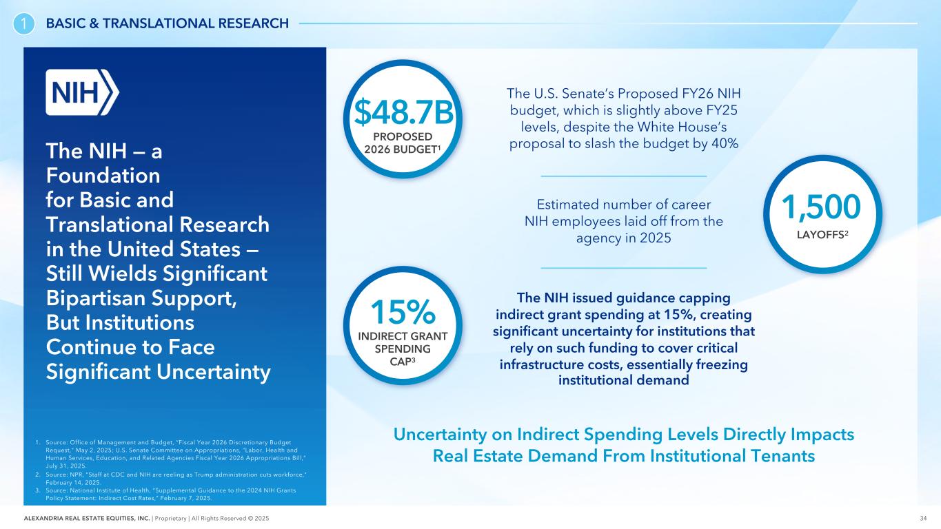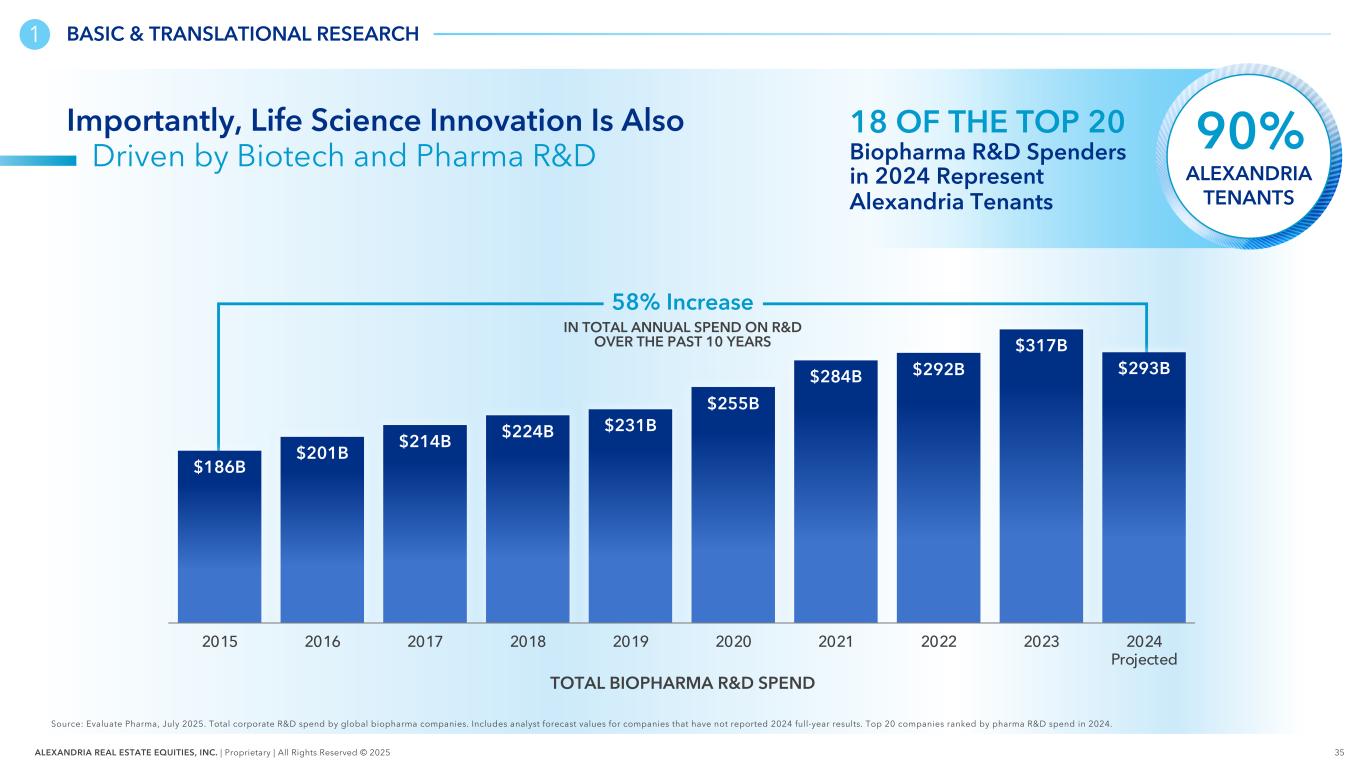 34ALEXANDRIA REAL ESTATE EQUITIES, INC. | Proprietary | All Rights Reserved © 2025 BASIC & TRANSLATIONAL RESEARCH1 The U.S. Senate’s Proposed FY26 NIH budget, which is slightly above FY25 levels, despite the White House’s proposal to slash the budget by 40% The NIH issued guidance capping indirect grant spending at 15%, creating significant uncertainty for institutions that rely on such funding to cover critical infrastructure costs, essentially freezing institutional demand $48.7B PROPOSED 2026 BUDGET1 15% INDIRECT GRANT SPENDING CAP3 The NIH — a Foundation for Basic and Translational Research in the United States — Still Wields Significant Bipartisan Support, But Institutions Continue to Face Significant Uncertainty Uncertainty on Indirect Spending Levels Directly Impacts Real Estate Demand From Institutional Tenants Estimated number of career NIH employees laid off from the agency in 2025 1,500 LAYOFFS2 1. Source: Office of Management and Budget, “Fiscal Year 2026 Discretionary Budget Request,“ May 2, 2025; U.S. Senate Committee on Appropriations, “Labor, Health and Human Services, Education, and Related Agencies Fiscal Year 2026 Appropriations Bill,“ July 31, 2025. 2. Source: NPR, “Staff at CDC and NIH are reeling as Trump administration cuts workforce,” February 14, 2025. 3. Source: National Institute of Health, “Supplemental Guidance to the 2024 NIH Grants Policy Statement: Indirect Cost Rates,” February 7, 2025.