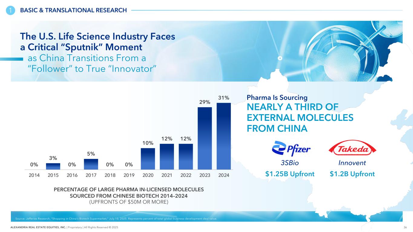 36ALEXANDRIA REAL ESTATE EQUITIES, INC. | Proprietary | All Rights Reserved © 2025 The U.S. Life Science Industry Faces a Critical “Sputnik” Moment as China Transitions From a “Follower” to True “Innovator” Source: Jefferies Research, “Shopping in China’s Biotech Supermarket,” July 13, 2025. Represents percent of total global business development deal value. BASIC & TRANSLATIONAL RESEARCH1 0% 3% 0% 5% 0% 0% 10% 12% 12% 29% 31% 2014 2015 2016 2017 2018 2019 2020 2021 2022 2023 2024 PERCENTAGE OF LARGE PHARMA IN-LICENSED MOLECULES SOURCED FROM CHINESE BIOTECH 2014–2024 (UPFRONTS OF $50M OR MORE) Pharma Is Sourcing NEARLY A THIRD OF EXTERNAL MOLECULES FROM CHINA 3SBio $1.25B Upfront Innovent $1.2B Upfront