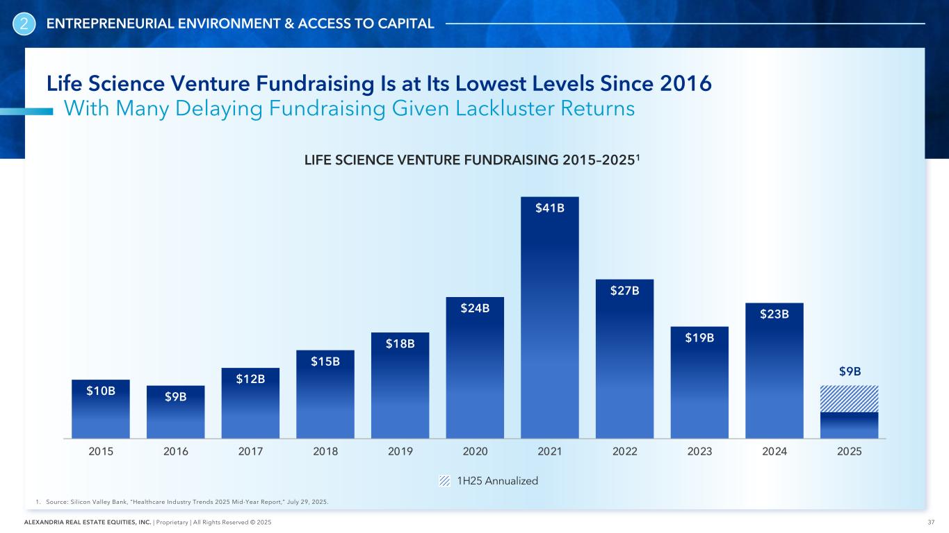 37ALEXANDRIA REAL ESTATE EQUITIES, INC. | Proprietary | All Rights Reserved © 2025 Life Science Venture Fundraising Is at Its Lowest Levels Since 2016 With Many Delaying Fundraising Given Lackluster Returns 1. Source: Silicon Valley Bank, “Healthcare Industry Trends 2025 Mid-Year Report,” July 29, 2025. $10B $9B $12B $15B $18B $24B $41B $27B $19B $23B 2015 2016 2017 2018 2019 2020 2021 2022 2023 2024 2025 LIFE SCIENCE VENTURE FUNDRAISING 2015–20251 $9B 1H25 Annualized 2 ENTREPRENEURIAL ENVIRONMENT & ACCESS TO CAPITAL