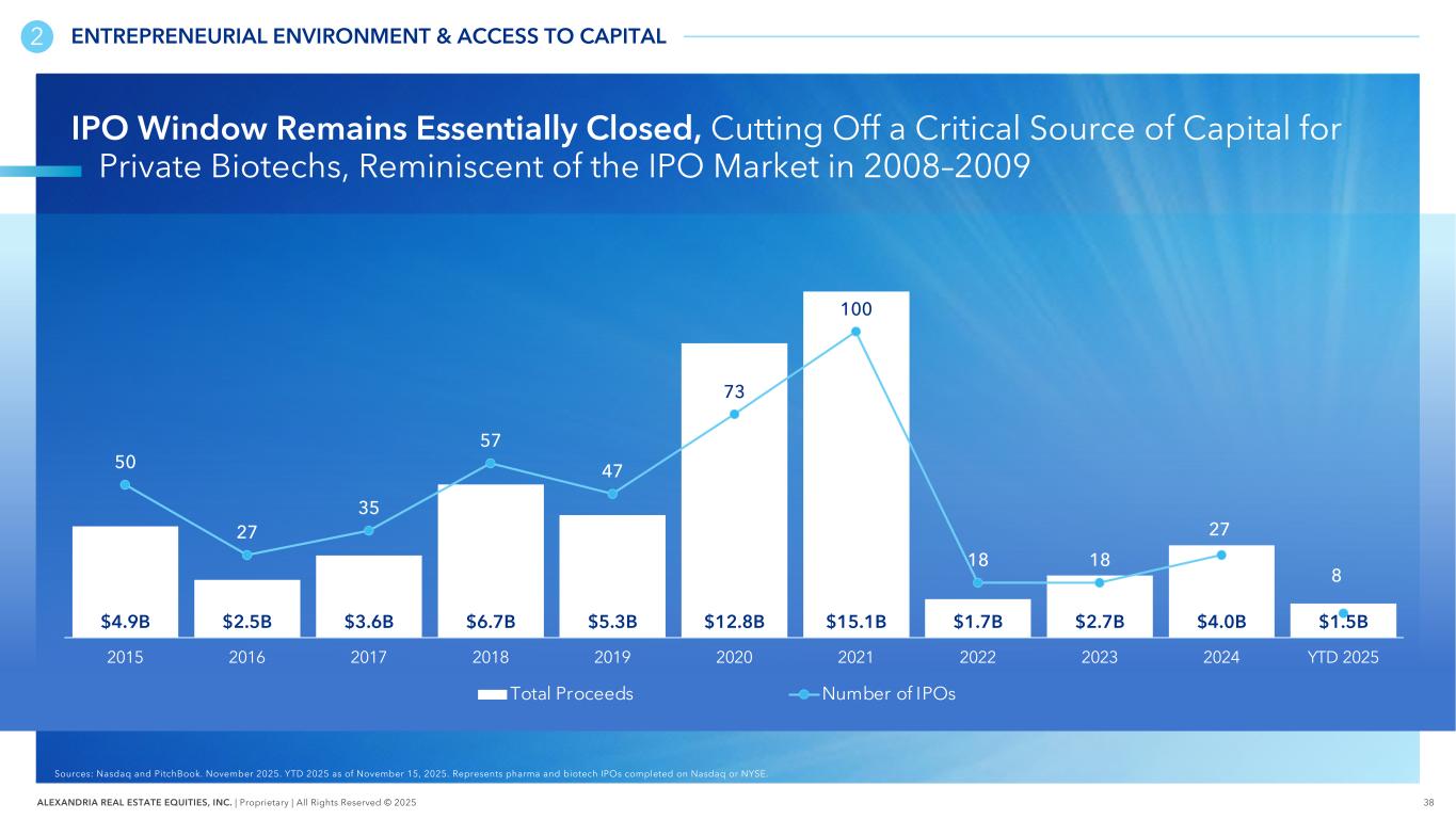 38ALEXANDRIA REAL ESTATE EQUITIES, INC. | Proprietary | All Rights Reserved © 2025 $4.9B $2.5B $3.6B $6.7B $5.3B $12.8B $15.1B $1.7B $2.7B $4.0B $1.5B 50 27 35 57 47 73 100 18 18 27 8 2015 2016 2017 2018 2019 2020 2021 2022 2023 2024 YTD 2025 Total Proceeds Number of IPOs IPO Window Remains Essentially Closed, Cutting Off a Critical Source of Capital for Private Biotechs, Reminiscent of the IPO Market in 2008–2009 Sources: Nasdaq and PitchBook. November 2025. YTD 2025 as of November 15, 2025. Represents pharma and biotech IPOs completed on Nasdaq or NYSE. 2 ENTREPRENEURIAL ENVIRONMENT & ACCESS TO CAPITAL