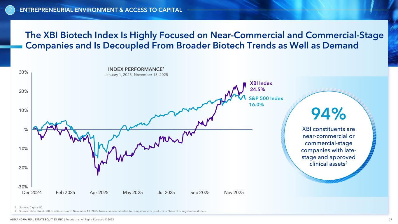 39ALEXANDRIA REAL ESTATE EQUITIES, INC. | Proprietary | All Rights Reserved © 2025 INDEX PERFORMANCE1 January 1, 2025—November 15, 2025 The XBI Biotech Index Is Highly Focused on Near-Commercial and Commercial-Stage Companies and Is Decoupled From Broader Biotech Trends as Well as Demand 1. Source: Capital IQ. 2. Source: State Street. XBI constituents as of November 13, 2025. Near-commercial refers to companies with products in Phase III or registrational trials. -30% -20% -10% % 10% 20% 30% Dec 2024 Feb 2025 Apr 2025 May 2025 Jul 2025 Sep 2025 Oct 2025 S&P 500 Index 16.0% XBI Index 24.5% 2 ENTREPRENEURIAL ENVIRONMENT & ACCESS TO CAPITAL XBI constituents are near-commercial or commercial-stage companies with late- stage and approved clinical assets2 94% Nov 0