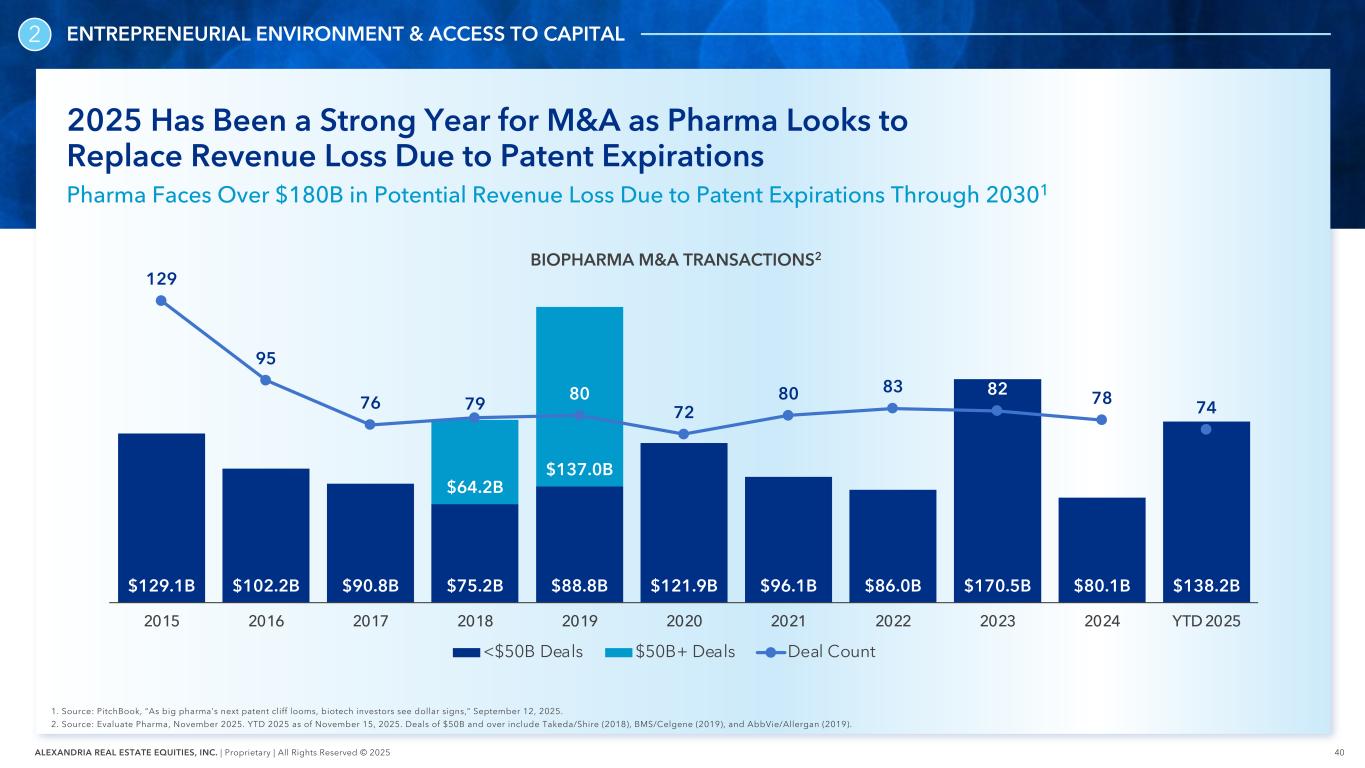 40ALEXANDRIA REAL ESTATE EQUITIES, INC. | Proprietary | All Rights Reserved © 2025 2 2025 Has Been a Strong Year for M&A as Pharma Looks to Replace Revenue Loss Due to Patent Expirations 1. Source: PitchBook, “As big pharma’s next patent cliff looms, biotech investors see dollar signs,” September 12, 2025. 2. Source: Evaluate Pharma, November 2025. YTD 2025 as of November 15, 2025. Deals of $50B and over include Takeda/Shire (2018), BMS/Celgene (2019), and AbbVie/Allergan (2019). $129.1B $102.2B $90.8B $75.2B $88.8B $121.9B $96.1B $86.0B $170.5B $80.1B $138.2B $64.2B $137.0B 129 95 76 79 80 72 80 83 82 78 74 2015 2016 2017 2018 2019 2020 2021 2022 2023 2024 YTD 2025 BIOPHARMA M&A TRANSACTIONS2 <$50B Deals $50B+ Deals Deal Count Pharma Faces Over $180B in Potential Revenue Loss Due to Patent Expirations Through 20301 ENTREPRENEURIAL ENVIRONMENT & ACCESS TO CAPITAL