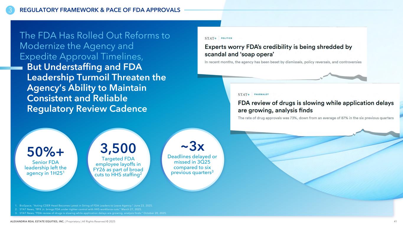 41ALEXANDRIA REAL ESTATE EQUITIES, INC. | Proprietary | All Rights Reserved © 2025 1. BioSpace, “Acting CDER Head Becomes Latest in String of FDA Leaders to Leave Agency.” June 23, 2025. 2. STAT News, “RFK Jr. brings FDA under tighter control with HHS workforce cuts.” March 27, 2025. 3. STAT News, “FDA review of drugs is slowing while application delays are growing, analysis finds.” October 20, 2025. 1 The FDA Has Rolled Out Reforms to Modernize the Agency and Expedite Approval Timelines, But Understaffing and FDA Leadership Turmoil Threaten the Agency’s Ability to Maintain Consistent and Reliable Regulatory Review Cadence 3 REGULATORY FRAMEWORK & PACE OF FDA APPROVALS 3,500 Targeted FDA employee layoffs in FY26 as part of broad cuts to HHS staffing2 ~3x Deadlines delayed or missed in 3Q25 compared to six previous quarters3 50%+ Senior FDA leadership left the agency in 1H251