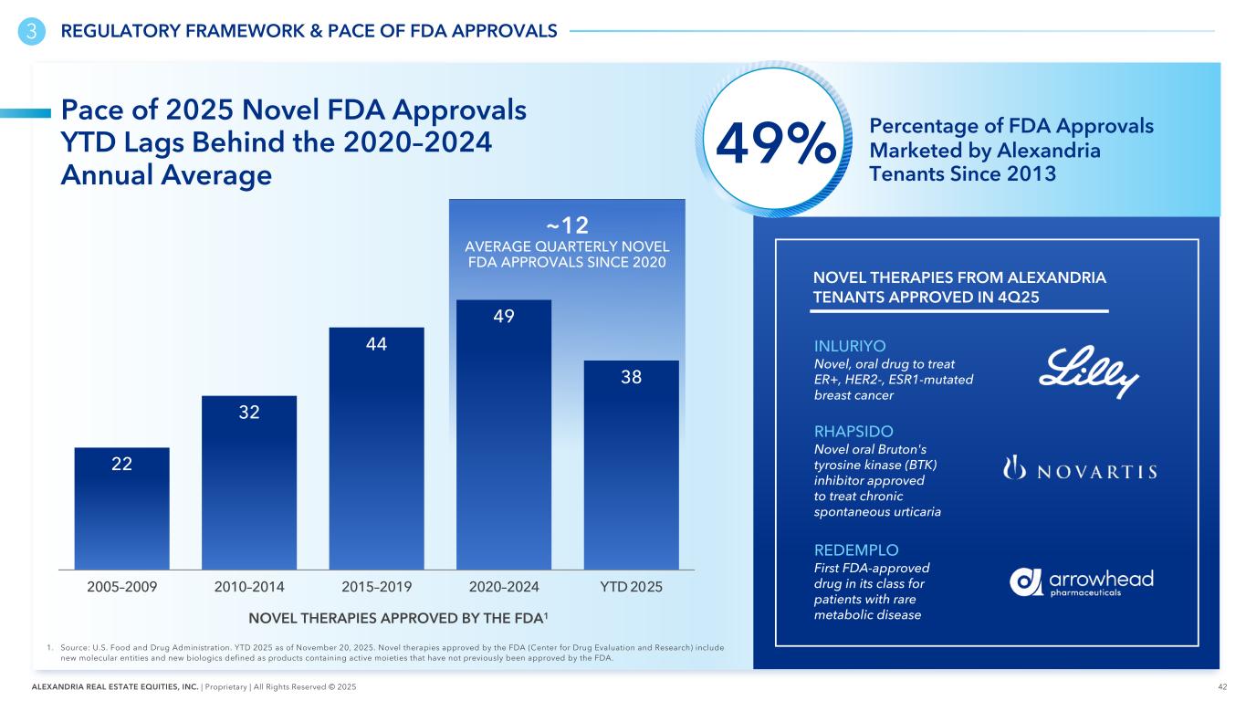 42ALEXANDRIA REAL ESTATE EQUITIES, INC. | Proprietary | All Rights Reserved © 2025 Pace of 2025 Novel FDA Approvals YTD Lags Behind the 2020–2024 Annual Average 1. Source: U.S. Food and Drug Administration. YTD 2025 as of November 20, 2025. Novel therapies approved by the FDA (Center for Drug Evaluation and Research) include new molecular entities and new biologics defined as products containing active moieties that have not previously been approved by the FDA. 3 REGULATORY FRAMEWORK & PACE OF FDA APPROVALS 22 32 44 49 38 2005–2009 2010–2014 2015–2019 2020–2024 YTD 2025 ~12 AVERAGE QUARTERLY NOVEL FDA APPROVALS SINCE 2020 NOVEL THERAPIES APPROVED BY THE FDA1 NOVEL THERAPIES FROM ALEXANDRIA TENANTS APPROVED IN 4Q25 RHAPSIDO Novel oral Bruton's tyrosine kinase (BTK) inhibitor approved to treat chronic spontaneous urticaria REDEMPLO First FDA-approved drug in its class for patients with rare metabolic disease INLURIYO Novel, oral drug to treat ER+, HER2-, ESR1-mutated breast cancer Percentage of FDA Approvals Marketed by Alexandria Tenants Since 2013 49%