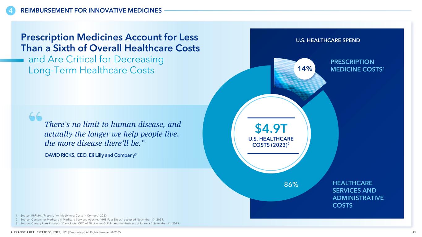 43ALEXANDRIA REAL ESTATE EQUITIES, INC. | Proprietary | All Rights Reserved © 2025 Prescription Medicines Account for Less Than a Sixth of Overall Healthcare Costs and Are Critical for Decreasing Long-Term Healthcare Costs 4 REIMBURSEMENT FOR INNOVATIVE MEDICINES 86% U.S. HEALTHCARE SPEND PRESCRIPTION MEDICINE COSTS1 HEALTHCARE SERVICES AND ADMINISTRATIVE COSTS $4.9T U.S. HEALTHCARE COSTS (2023)2 1. Source: PhRMA, “Prescription Medicines: Costs in Context,” 2023. 2. Source: Centers for Medicare & Medicaid Services website, “NHE Fact Sheet,“ accessed November 13, 2025. 3. Source: Cheeky Pints Podcast, “Dave Ricks, CEO of Eli Lilly, on GLP-1s and the Business of Pharma.” November 11, 2025. 14% There’s no limit to human disease, and actually the longer we help people live, the more disease there’ll be.” DAVID RICKS, CEO, Eli Lilly and Company3