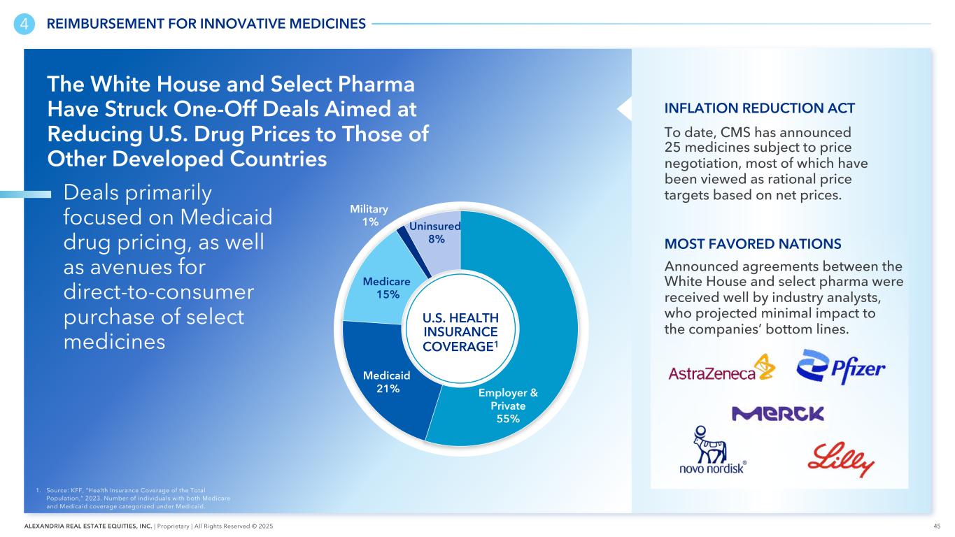 44ALEXANDRIA REAL ESTATE EQUITIES, INC. | Proprietary | All Rights Reserved © 2025 Pharmacy Benefit Managers (PBMs) and Hospitals Significantly Drive Up the Cost of Medicines for Patients Source: PhRMA, “10 Things You Should Know About Medicine Spending and Costs.” March 10, 2022. >50% of Prescription Medicine Spend Goes to Middlemen, Including PBMs, Hospitals, and Insurers 4 REIMBURSEMENT FOR INNOVATIVE MEDICINES 9 out of 10 Medicines Dispensed in the U.S. Are Generics 500% Average Hospital Markup on Prescription Medicines