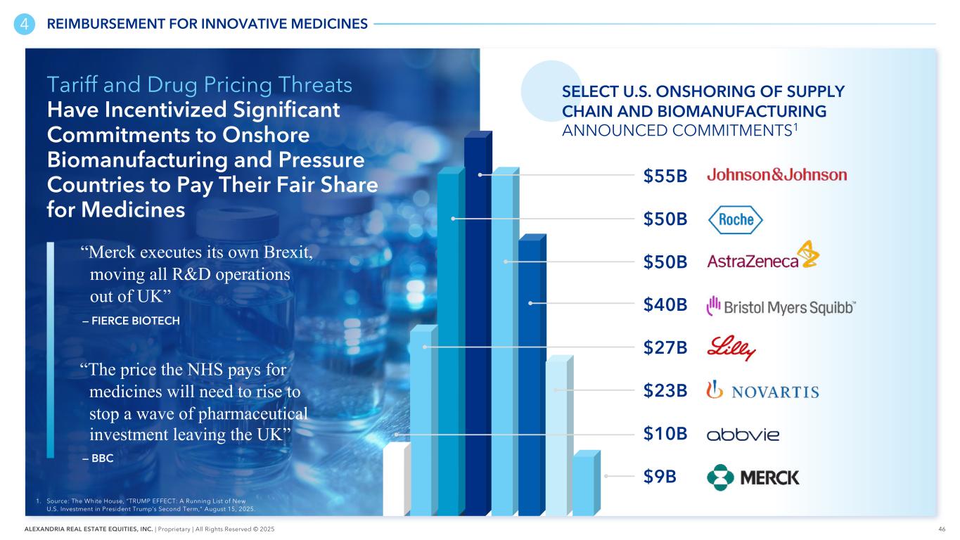 46ALEXANDRIA REAL ESTATE EQUITIES, INC. | Proprietary | All Rights Reserved © 2025 4 REIMBURSEMENT FOR INNOVATIVE MEDICINES Tariff and Drug Pricing Threats Have Incentivized Significant Commitments to Onshore Biomanufacturing and Pressure Countries to Pay Their Fair Share for Medicines “Merck executes its own Brexit, moving all R&D operations out of UK” — FIERCE BIOTECH “The price the NHS pays for medicines will need to rise to stop a wave of pharmaceutical investment leaving the UK” 1. Source: The White House, “TRUMP EFFECT: A Running List of New U.S. Investment in President Trump’s Second Term,” August 15, 2025. $55B $50B $40B $27B $23B $10B $9B $50B SELECT U.S. ONSHORING OF SUPPLY CHAIN AND BIOMANUFACTURING ANNOUNCED COMMITMENTS1 — BBC