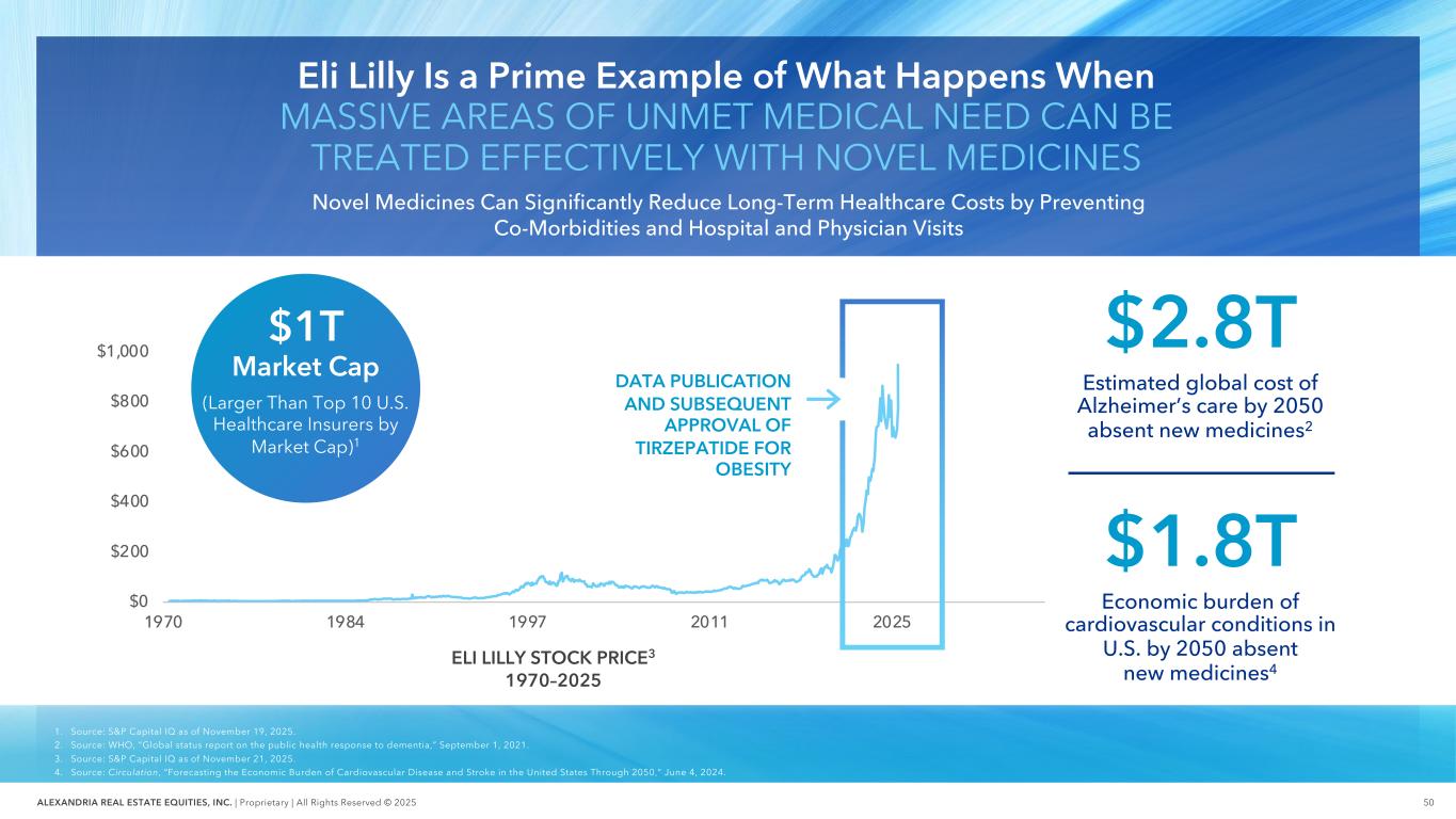 50ALEXANDRIA REAL ESTATE EQUITIES, INC. | Proprietary | All Rights Reserved © 2025 $0 $200 $400 $600 $800 $1,000 1970 1984 1997 2011 2025 ELI LILLY STOCK PRICE3 1970–2025 Eli Lilly Is a Prime Example of What Happens When MASSIVE AREAS OF UNMET MEDICAL NEED CAN BE TREATED EFFECTIVELY WITH NOVEL MEDICINES 1. Source: S&P Capital IQ as of November 19, 2025. 2. Source: WHO, “Global status report on the public health response to dementia,” September 1, 2021. 3. Source: S&P Capital IQ as of November 21, 2025. 4. Source: Circulation, “Forecasting the Economic Burden of Cardiovascular Disease and Stroke in the United States Through 2050,” June 4, 2024. DATA PUBLICATION AND SUBSEQUENT APPROVAL OF TIRZEPATIDE FOR OBESITY Estimated global cost of Alzheimer’s care by 2050 absent new medicines2 $2.8T Economic burden of cardiovascular conditions in U.S. by 2050 absent new medicines4 $1.8T $1T Market Cap (Larger Than Top 10 U.S. Healthcare Insurers by Market Cap)1 Novel Medicines Can Significantly Reduce Long-Term Healthcare Costs by Preventing Co-Morbidities and Hospital and Physician Visits