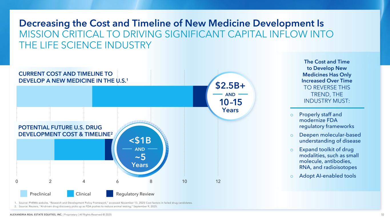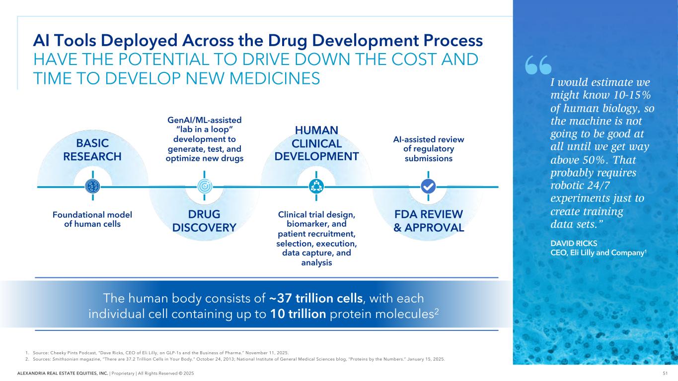 51ALEXANDRIA REAL ESTATE EQUITIES, INC. | Proprietary | All Rights Reserved © 2025 AI Tools Deployed Across the Drug Development Process HAVE THE POTENTIAL TO DRIVE DOWN THE COST AND TIME TO DEVELOP NEW MEDICINES 1. Source: Cheeky Pints Podcast, “Dave Ricks, CEO of Eli Lilly, on GLP-1s and the Business of Pharma.” November 11, 2025. 2. Sources: Smithsonian magazine, “There are 37.2 Trillion Cells in Your Body.” October 24, 2013; National Institute of General Medical Sciences blog, “Proteins by the Numbers.” January 15, 2025. BASIC RESEARCH HUMAN CLINICAL DEVELOPMENT FDA REVIEW & APPROVAL DRUG DISCOVERY Foundational model of human cells GenAI/ML-assisted “lab in a loop” development to generate, test, and optimize new drugs Clinical trial design, biomarker, and patient recruitment, selection, execution, data capture, and analysis AI-assisted review of regulatory submissions I would estimate we might know 10-15% of human biology, so the machine is not going to be good at all until we get way above 50%. That probably requires robotic 24/7 experiments just to create training data sets.” DAVID RICKS CEO, Eli Lilly and Company1 The human body consists of ~37 trillion cells, with each individual cell containing up to 10 trillion protein molecules2