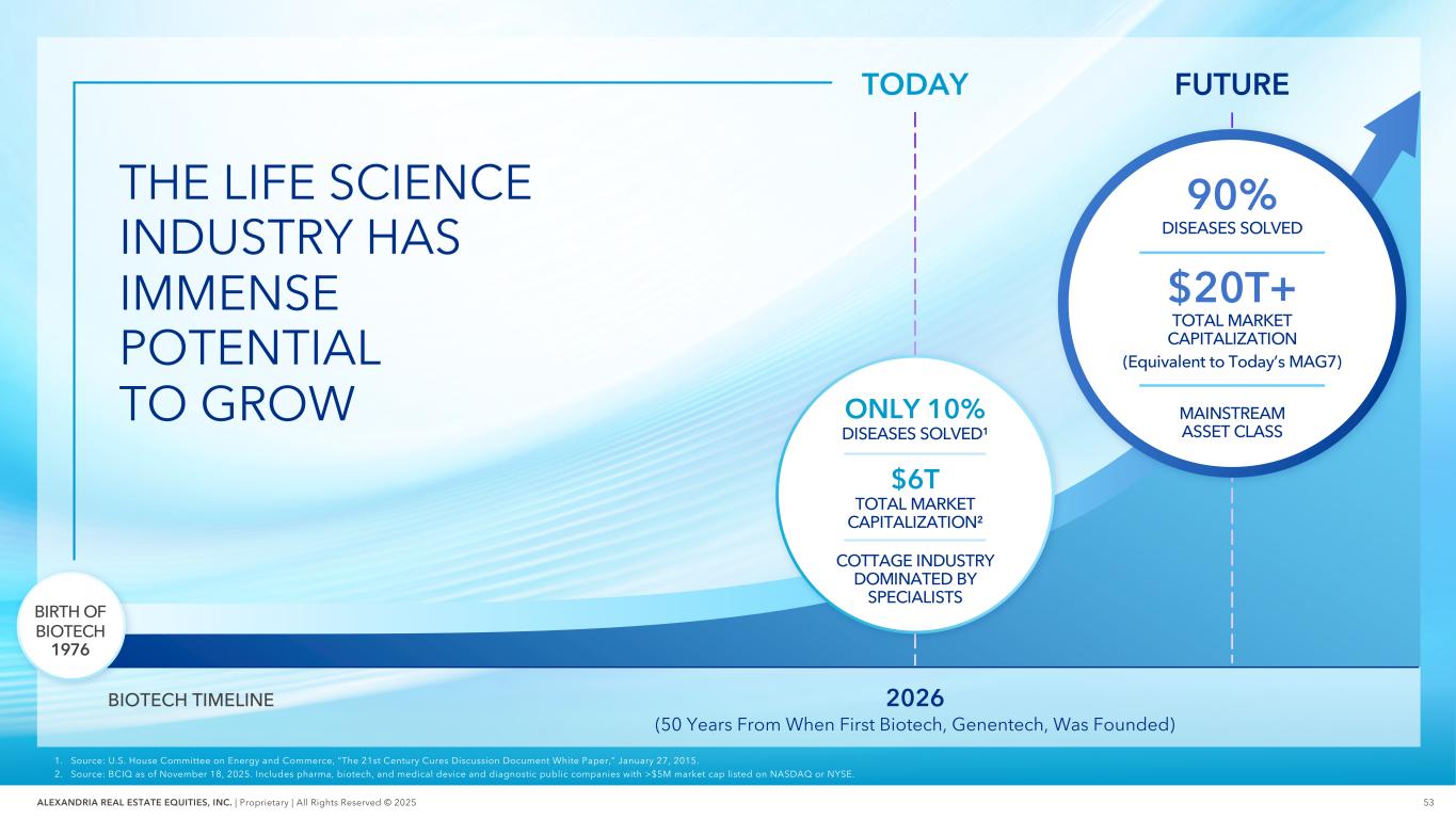 52ALEXANDRIA REAL ESTATE EQUITIES, INC. | Proprietary | All Rights Reserved © 2025 Decreasing the Cost and Timeline of New Medicine Development Is MISSION CRITICAL TO DRIVING SIGNIFICANT CAPITAL INFLOW INTO THE LIFE SCIENCE INDUSTRY 0 2 4 6 8 10 12 The Cost and Time to Develop New Medicines Has Only Increased Over Time TO REVERSE THIS TREND, THE INDUSTRY MUST: o Properly staff and modernize FDA regulatory frameworks o Deepen molecular-based understanding of disease o Expand toolkit of drug modalities, such as small molecule, antibodies, RNA, and radioisotopes o Adopt AI-enabled tools Preclinical Clinical Regulatory Review $2.5B+ 10 –15 Years AND CURRENT COST AND TIMELINE TO DEVELOP A NEW MEDICINE IN THE U.S.1 POTENTIAL FUTURE U.S. DRUG DEVELOPMENT COST & TIMELINE2 <$1B ~5 Years AND 1. Source: PhRMA website, ”Research and Development Policy Framework,” accessed November 13, 2025 Cost factors in failed drug candidates. 2. Source: Reuters, “AI-driven drug discovery picks up as FDA pushes to reduce animal testing,” September 9, 2025.