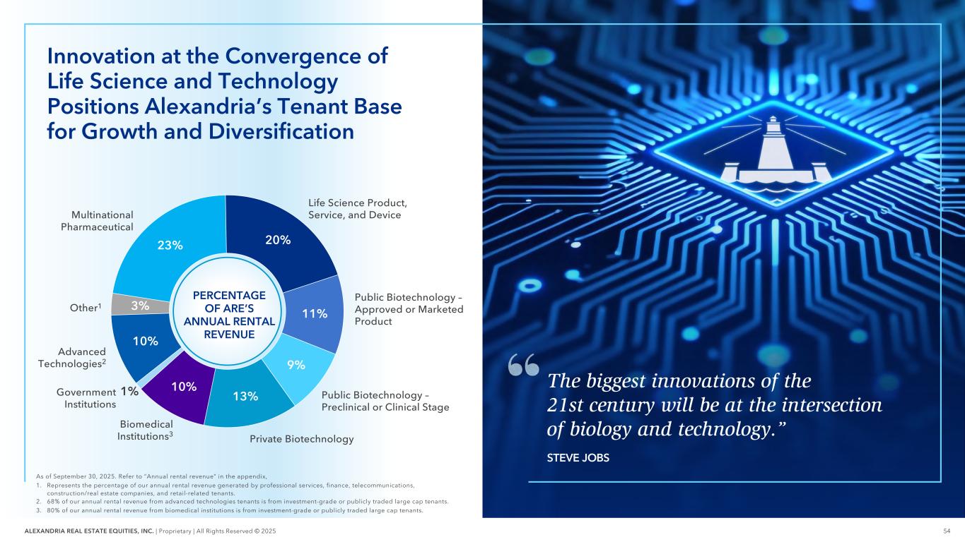 53ALEXANDRIA REAL ESTATE EQUITIES, INC. | Proprietary | All Rights Reserved © 2025 THE LIFE SCIENCE INDUSTRY HAS IMMENSE POTENTIAL TO GROW BIOTECH TIMELINE TODAY FUTURE BIRTH OF BIOTECH 1976 ONLY 10% DISEASES SOLVED¹ $6T TOTAL MARKET CAPITALIZATION² COTTAGE INDUSTRY DOMINATED BY SPECIALISTS 90% DISEASES SOLVED $20T+ TOTAL MARKET CAPITALIZATION (Equivalent to Today’s MAG7) MAINSTREAM ASSET CLASS 1. Source: U.S. House Committee on Energy and Commerce, “The 21st Century Cures Discussion Document White Paper,” January 27, 2015. 2. Source: BCIQ as of November 18, 2025. Includes pharma, biotech, and medical device and diagnostic public companies with >$5M market cap listed on NASDAQ or NYSE. 2026 (50 Years From When First Biotech, Genentech, Was Founded)