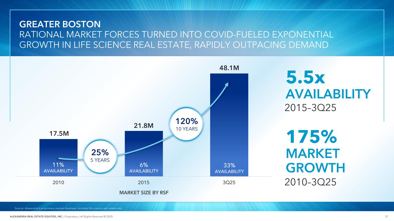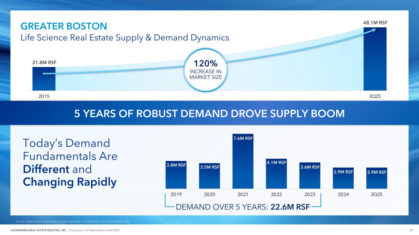 57ALEXANDRIA REAL ESTATE EQUITIES, INC. | Proprietary | All Rights Reserved © 2025 2010 2015 3Q25 Source: Alexandria’s proprietary market database. Includes life science real estate only. GREATER BOSTON RATIONAL MARKET FORCES TURNED INTO COVID-FUELED EXPONENTIAL GROWTH IN LIFE SCIENCE REAL ESTATE, RAPIDLY OUTPACING DEMAND 17.5M 21.8M 48.1M 175% MARKET GROWTH 2010–3Q25 25% 5 YEARS 120% 10 YEARS 6% AVAILABILITY 33% AVAILABILITY 5.5x AVAILABILITY 2015–3Q25 MARKET SIZE BY RSF 11% AVAILABILITY