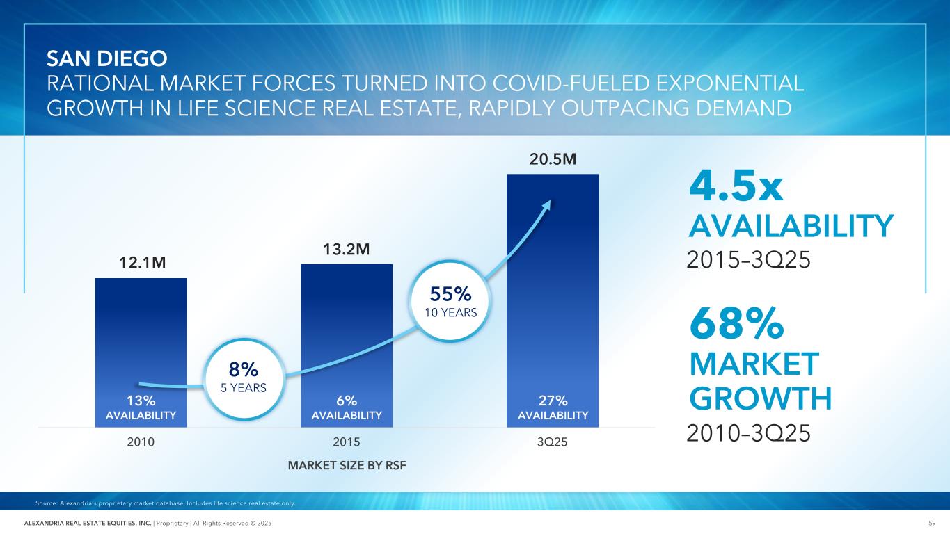 58ALEXANDRIA REAL ESTATE EQUITIES, INC. | Proprietary | All Rights Reserved © 2025 2019 2020 2021 2022 2023 2024 3Q25 2015 3Q25 Source: Alexandria’s proprietary market database. Includes life science real estate only. 21.8M RSF 48.1M RSF 7.6M RSF 3.6M RSF 4.1M RSF 2.9M RSF 120% INCREASE IN MARKET SIZE DEMAND OVER 5 YEARS: 22.6M RSF 2.9M RSF 5 YEARS OF ROBUST DEMAND DROVE SUPPLY BOOM GREATER BOSTON Life Science Real Estate Supply & Demand Dynamics Today’s Demand Fundamentals Are Different and Changing Rapidly 3.5M RSF3.8M RSF