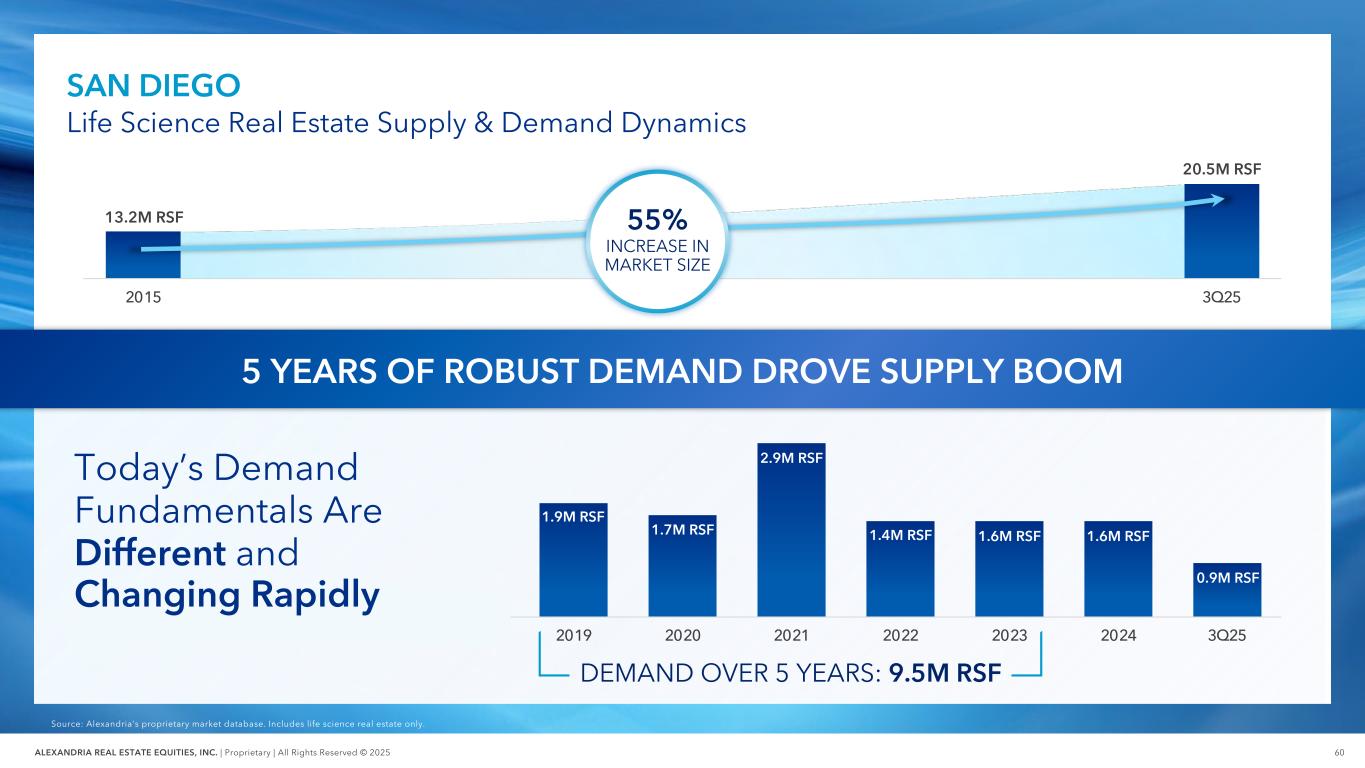 59ALEXANDRIA REAL ESTATE EQUITIES, INC. | Proprietary | All Rights Reserved © 2025 2010 2015 3Q25 Source: Alexandria’s proprietary market database. Includes life science real estate only. SAN DIEGO RATIONAL MARKET FORCES TURNED INTO COVID-FUELED EXPONENTIAL GROWTH IN LIFE SCIENCE REAL ESTATE, RAPIDLY OUTPACING DEMAND 12.1M 13.2M 20.5M 68% MARKET GROWTH 2010–3Q25 8% 5 YEARS 55% 10 YEARS 6% AVAILABILITY 27% AVAILABILITY 4.5x AVAILABILITY 2015–3Q25 MARKET SIZE BY RSF 13% AVAILABILITY