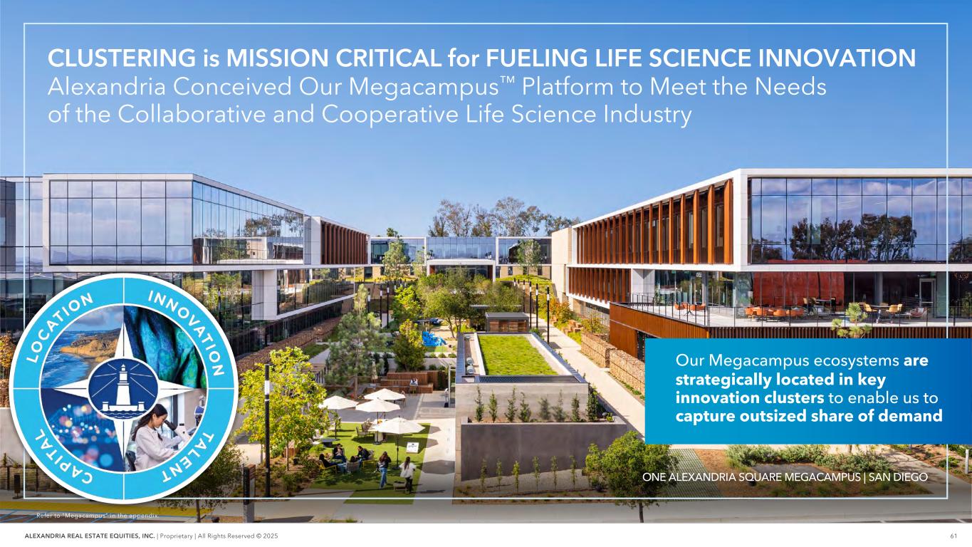 60ALEXANDRIA REAL ESTATE EQUITIES, INC. | Proprietary | All Rights Reserved © 2025 Source: Alexandria’s proprietary market database. Includes life science real estate only. 2019 2020 2021 2022 2023 2024 3Q25 1.9M RSF 1.7M RSF 2.9M RSF 1.4M RSF 1.6M RSF1.6M RSF 0.9M RSF 2015 3Q25 13.2M RSF 20.5M RSF 55% INCREASE IN MARKET SIZE DEMAND OVER 5 YEARS: 9.5M RSF SAN DIEGO Life Science Real Estate Supply & Demand Dynamics 5 YEARS OF ROBUST DEMAND DROVE SUPPLY BOOM Today’s Demand Fundamentals Are Different and Changing Rapidly