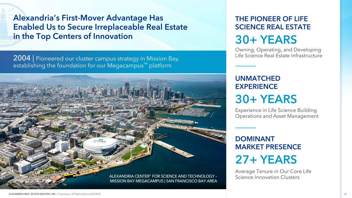 62ALEXANDRIA REAL ESTATE EQUITIES, INC. | Proprietary | All Rights Reserved © 2025 Refer to “Megacampus” in the appendix. CLUSTERING is the DNA of the LIFE SCIENCE INDUSTRY A L E X A N D R I A ’ S IRREPLACEABLE P L A T F O R M THE DNA of the ALEXANDRIA MEGACAMPUS PLATFORM ALEXANDRIA’S PROPRIETARY ALGORITHM Driving Our Differentiated Megacampus™ Strategy