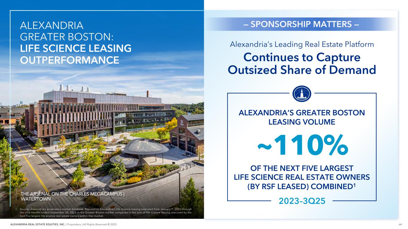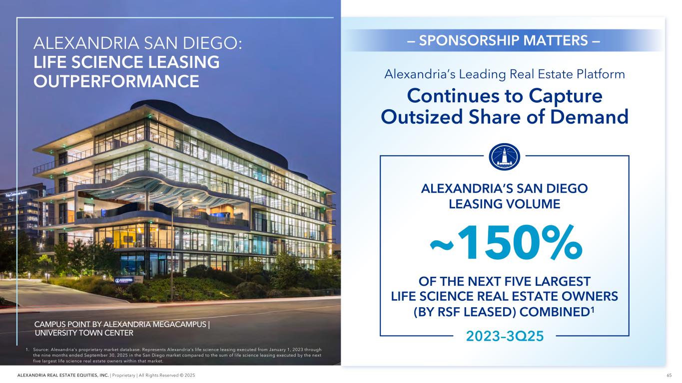 64ALEXANDRIA REAL ESTATE EQUITIES, INC. | Proprietary | All Rights Reserved © 2025 ALEXANDRIA GREATER BOSTON: LIFE SCIENCE LEASING OUTPERFORMANCE 1. Source: Alexandria’s proprietary market database. Represents Alexandria’s life science leasing executed from January 1, 2023 through the nine months ended September 30, 2025 in the Greater Boston market compared to the sum of life science leasing executed by the next five largest life science real estate owners within that market. Alexandria’s Leading Real Estate Platform Continues to Capture Outsized Share of Demand ALEXANDRIA’S GREATER BOSTON LEASING VOLUME ~110% OF THE NEXT FIVE LARGEST LIFE SCIENCE REAL ESTATE OWNERS (BY RSF LEASED) COMBINED1 2023–3Q25 — SPONSORSHIP MATTERS — THE ARSENAL ON THE CHARLES MEGACAMPUS | WATERTOWN
