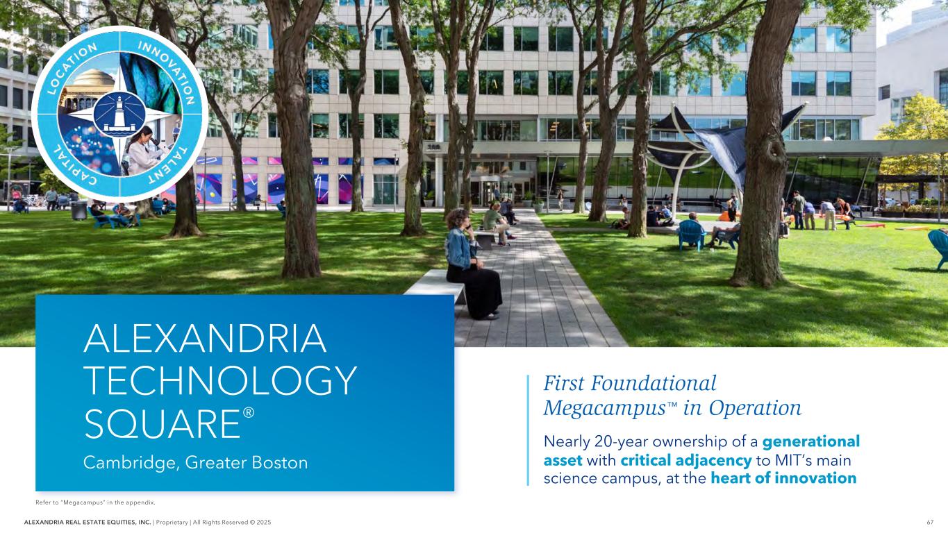 66ALEXANDRIA REAL ESTATE EQUITIES, INC. | Proprietary | All Rights Reserved © 2025 MEGACAMPUS™ CASE STUDIES A L E X A N D R I A ’ S IRREPLACEABLE P L A T F O R M ALEXANDRIA TECHNOLOGY SQUARE® CAMBRIDGE Established 2006 CAMPUS POINT BY ALEXANDRIA SAN DIEGO Established 2010 Refer to "Megacampus” in the appendix.