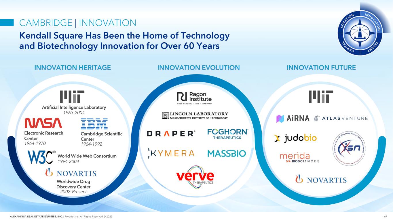 68ALEXANDRIA REAL ESTATE EQUITIES, INC. | Proprietary | All Rights Reserved © 2025 MAIN STREET MEGACAMPUS: ALEXANDRIA TECHNOLOGY SQUARE® 1.2M RSF | 7 Properties MEGACAMPUS: ALEXANDRIA CENTER® AT ONE KENDALL SQUARE 1.4M RSF | 12 Properties MEGACAMPUS: ALEXANDRIA CENTER® AT KENDALL SQUARE 2.2M RSF | 8 Properties B IN N E Y S TR E E T KENDALL/MIT BR O A D W A Y CHARLES/MGH CAMBRIDGE | LOCATION Alexandria’s Significant Presence in Kendall Square “The Most Innovative Square Mile on the Planet”1 of Alexandria’s Greater Boston ARR Is Within Our East Cambridge Megacampuses2 62% As of September 30, 2025. ARR represents annual rental revenue. Refer to “Annual rental revenue” and “Megacampus” in the appendix. 1. Source: Massachusetts Institute of Technology, “Kendall Square Initiative.” 2. Represents the aggregate annual rental revenue, at 100%, of our Alexandria Center® at Kendall Square, Alexandria Center® at One Kendall Square, and Alexandria Technology Square® megacampuses divided by the total annual rental revenue, in our Greater Boston market.