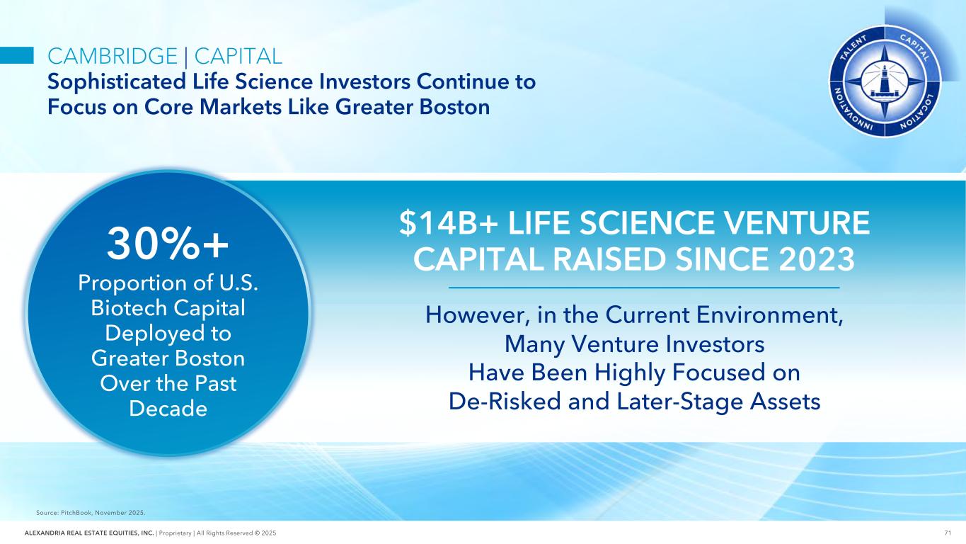 70ALEXANDRIA REAL ESTATE EQUITIES, INC. | Proprietary | All Rights Reserved © 2025 Refer to “Megacampus” in the appendix. 1. Source: Massachusetts Technology Collaborative website, “Why Massachusetts,” accessed November 10, 2025. 2. Source: The Innovation Institute at the MassTech Collaborative, “Annual Index of the Massachusetts Innovation Economy,” 2023 Edition. MEGACAMPUS: ALEXANDRIA TECHNOLOGY SQUARE® #1 STEM graduates per capita and percentage of adults with bachelor’s degree or higher1 #1 High-tech job concentration1 1.4M+ Workers in the innovation economy or 39% of Massachusetts workforce1,2 CAMBRIDGE | TALENT Greater Boston’s Attractive STEM Talent Base at the Intersection of Science and Technology The Ray and Maria Stata Center